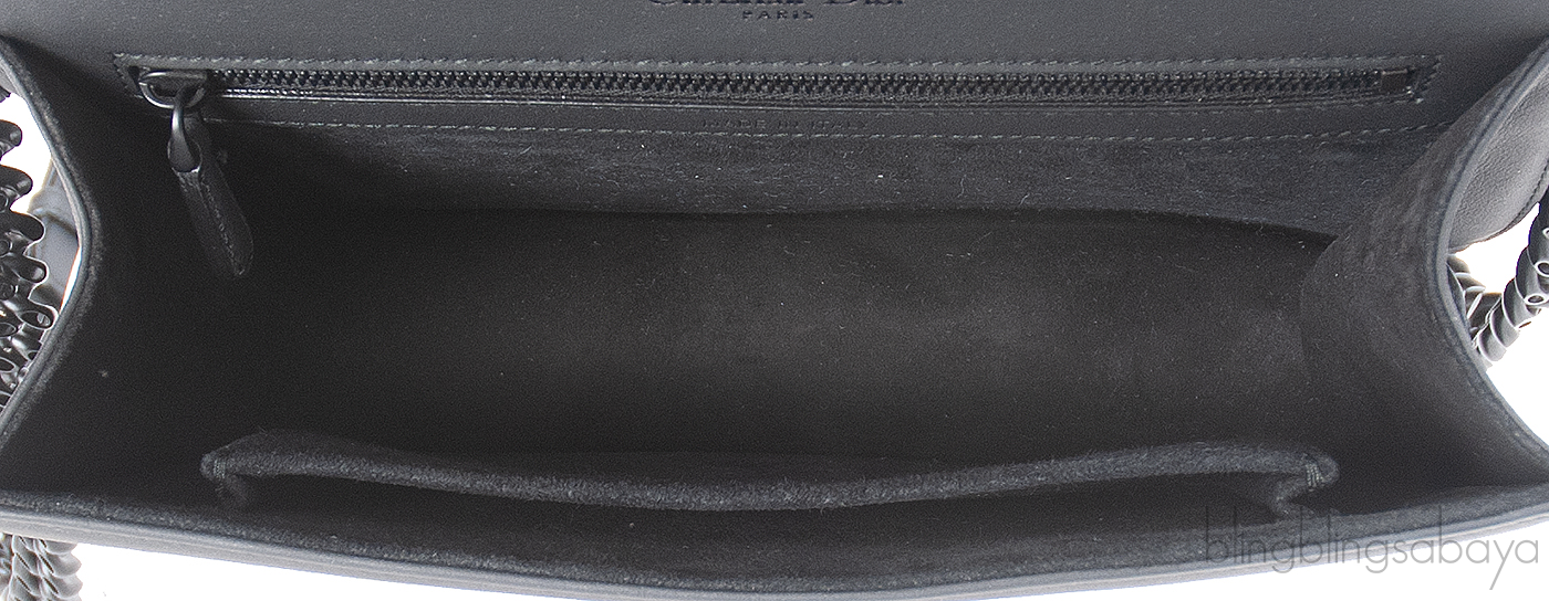 This stunning ultra matte shoulder bag features an oversized cannage stitching design with crest shape clasp in black metal at flap cover. It has a long chain shoulder strap with open work and engraved links. Interior is fully lined with black fabric revealing a roomy interior with one zip pocket and open patch compartment.