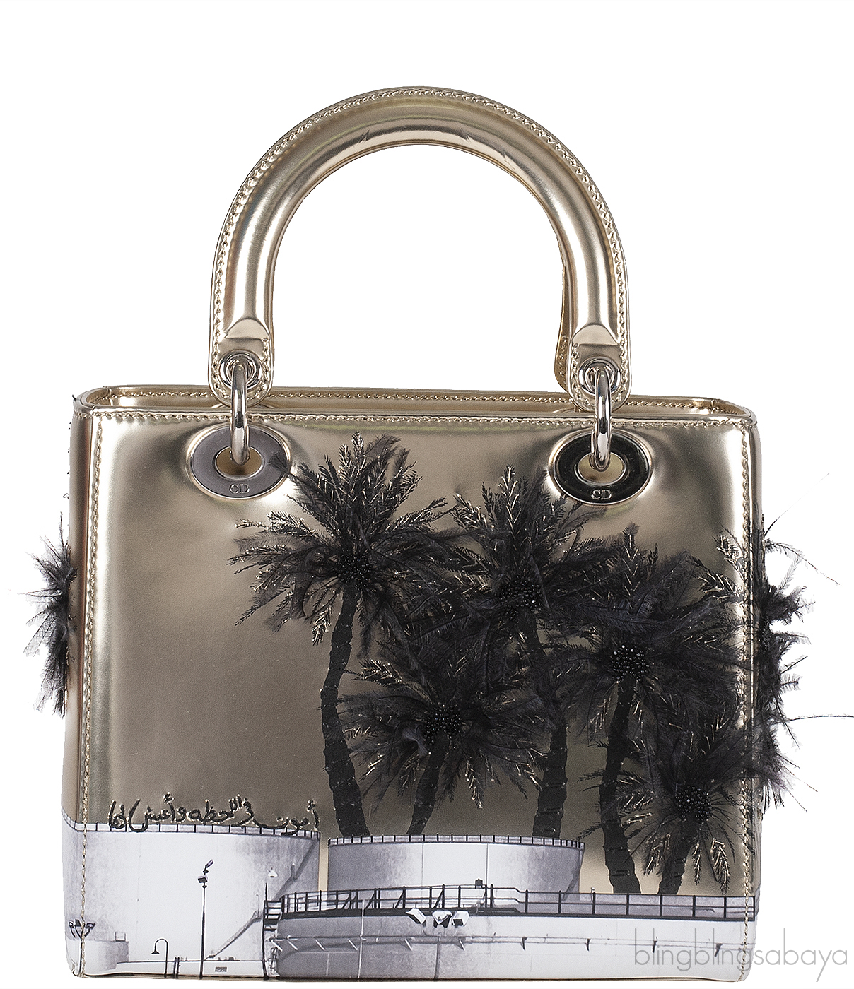 This Christian Dior Lady Dior Art \"Manal Aldowayan\" Metallic Palm Art Bag from the Dior x Manal Aldowayan collaboration is crafted from luminous metallic gold leather, accented with silver hardware. The bag features a striking palm tree artwork, adorned with black feathers and layered with Arabic script, a powerful tribute to Middle Eastern heritage and contemporary expression.