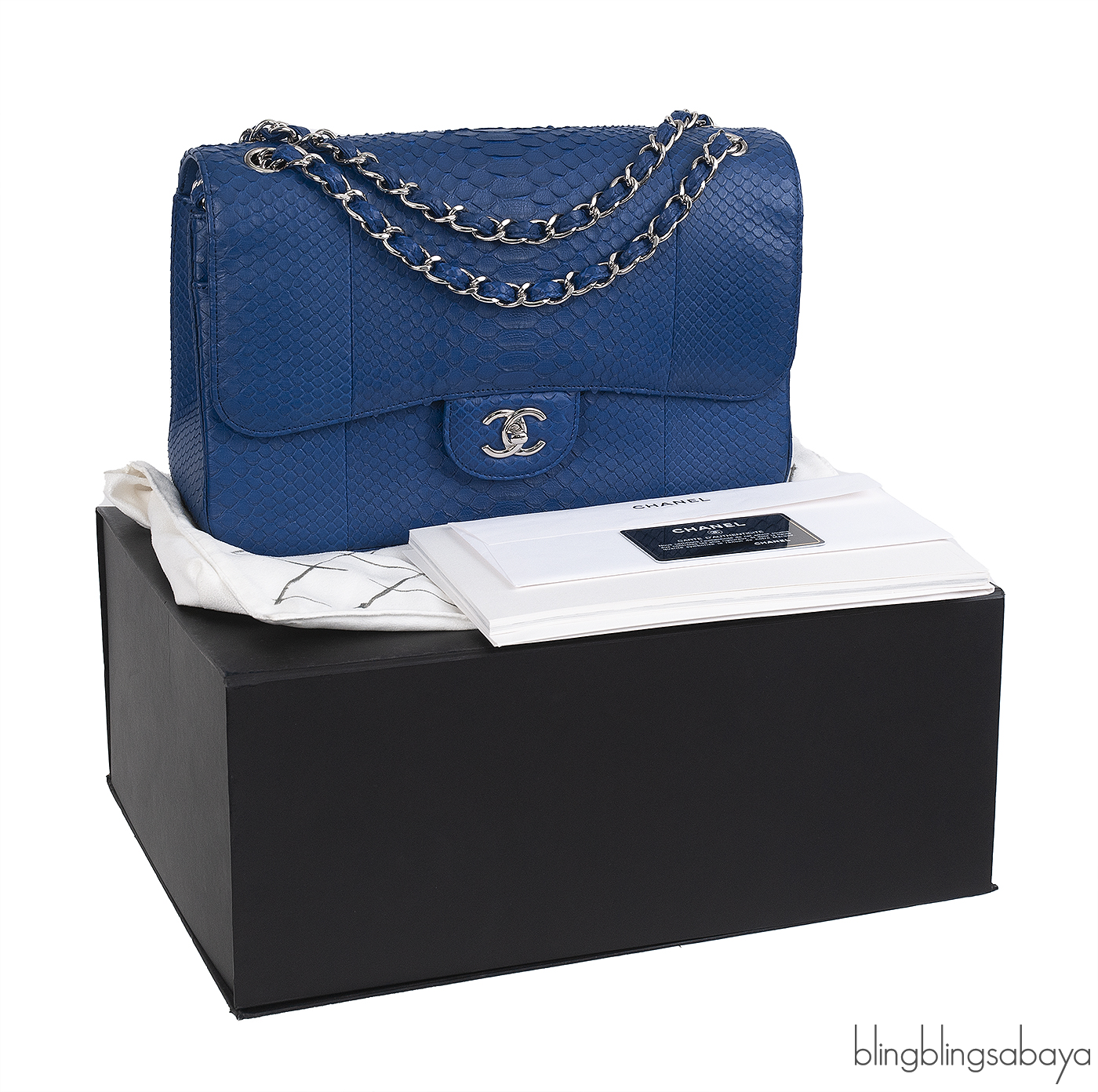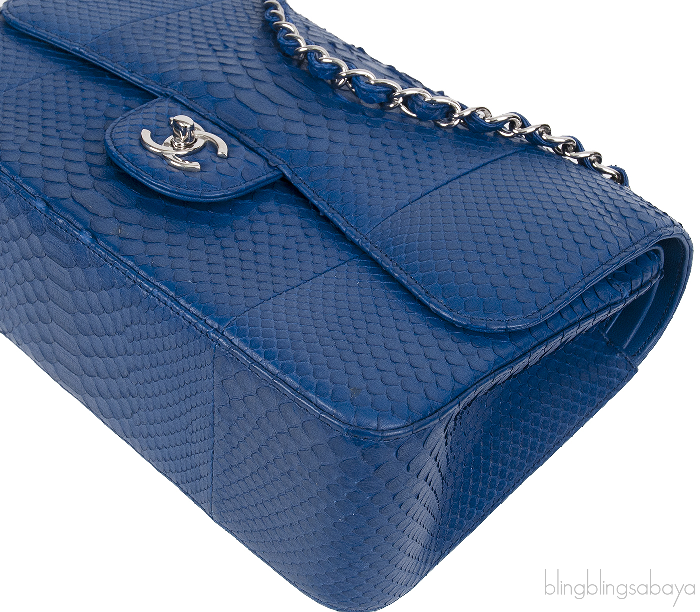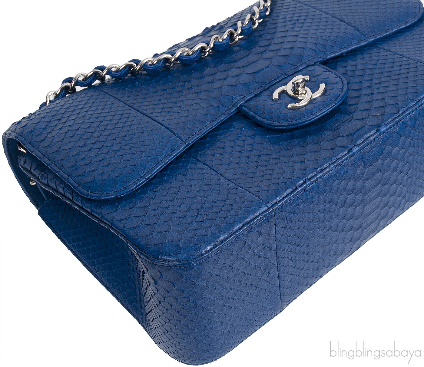 Gorgeous as ever! This charming and beautiful Chanel Classic Flap bag features a blue colored exotic Python accented with Silver Hardware. It features the famous twist lock CC closure in shiny gold tone and has a double chain linking shoulder strap that is interlaced with the python leather.
