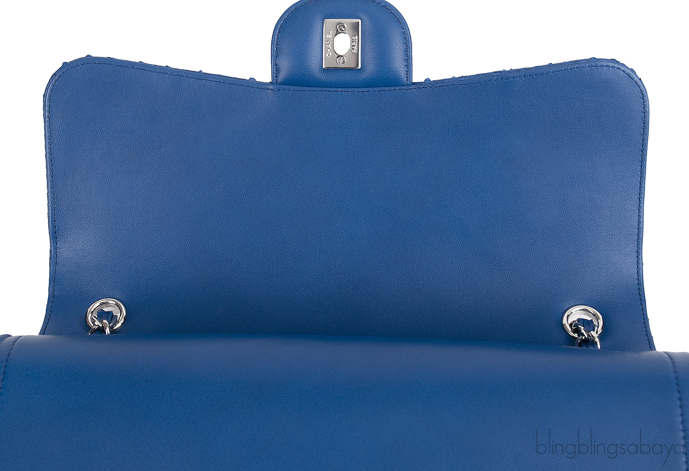 This beautiful bag features zippered compartment on the front flap while the second flap shows a large stitched CC logo. The roomy interior is made of coordinating blue leather and reveals several pockets for easy organization.