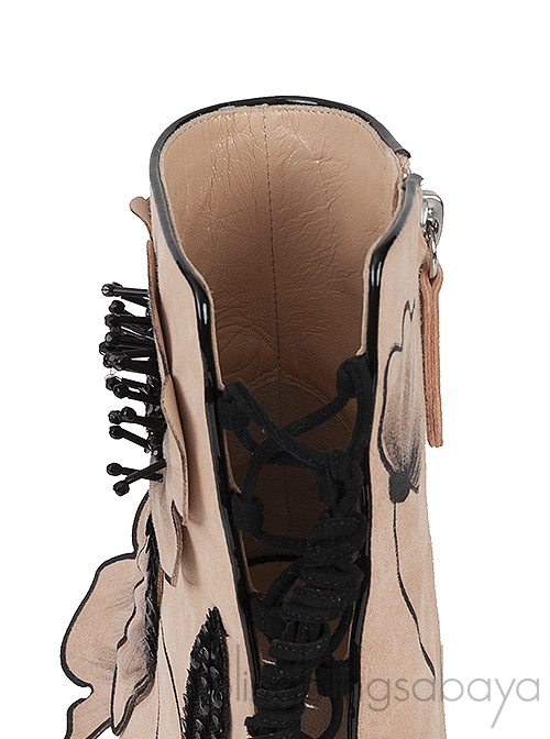 These Coline Suede Floral Boots from Giuseppe Zanotti are crafted from beige suede leather with black trim leather. These boots features a floral patch accented with black beads and sequins, black lace, peep almond toe, black patent heels and leather insole and sole.