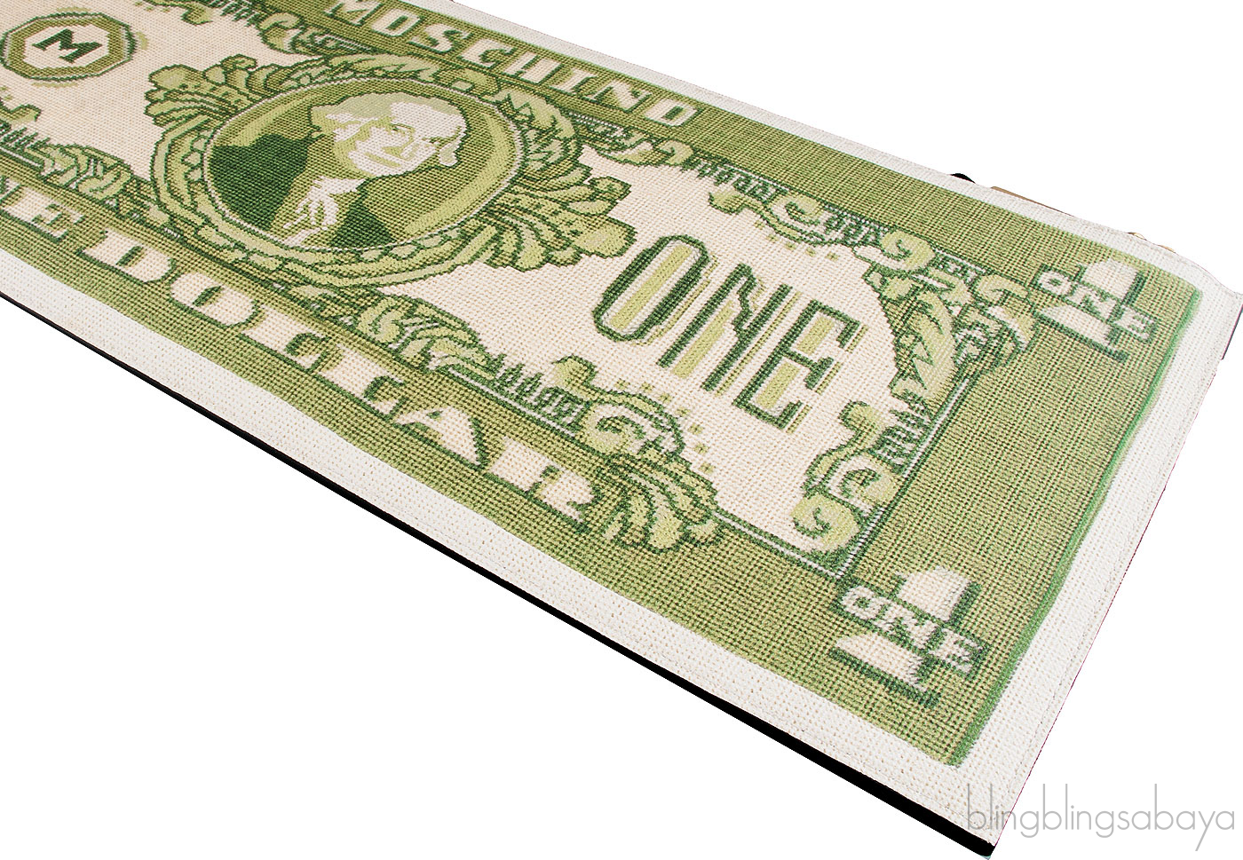 Empowering women of all ages, Moschino is all about high spirits and even higher impact. Bold colors and quirky graphics dominate the new collection. this green leather Dollar Bill clutch bag from Moschino features a rectangular body, gold-tone hardware, a top zip closure, a woven design made to mimic that of a dollar bill, a lettered logo to the front and an oversized style.