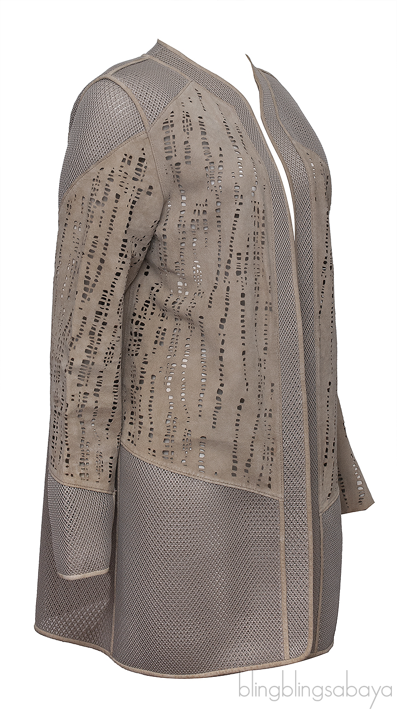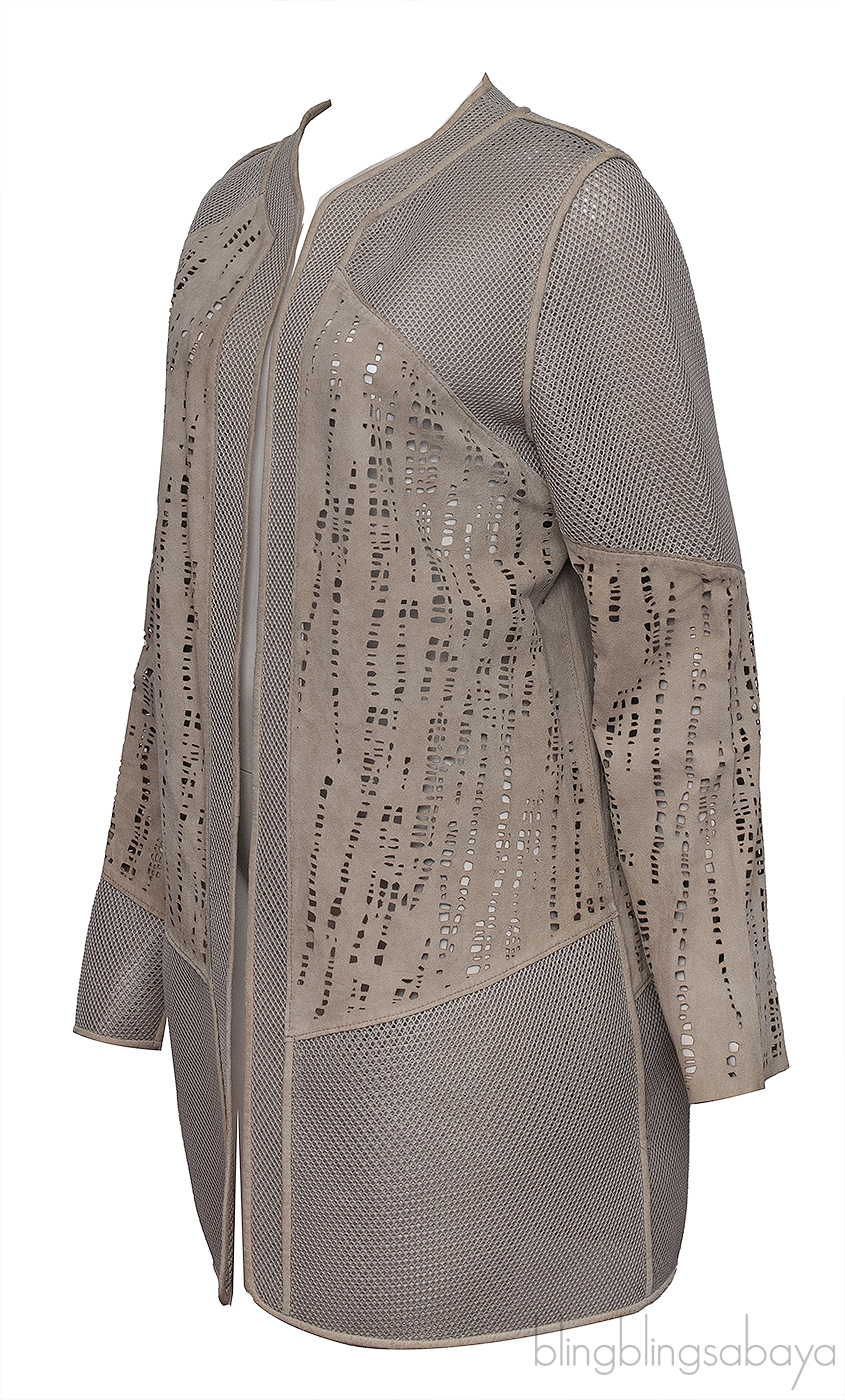 This Elie Tahari Beige Perforated Mesh Leather Cardigan is crafted from 100& lamb skin. 100% Polyester mesh fabric. This cardigan features open front, perforated and mesh detailing, long sleeves.