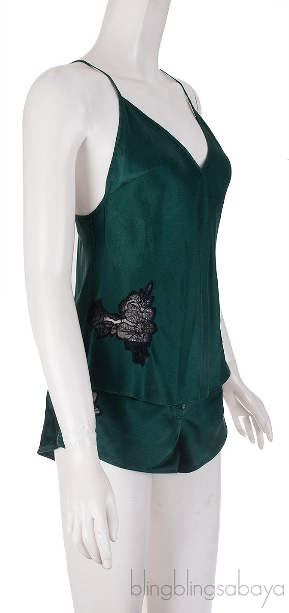 This Emerald Green Camisole Set from Agent Provocateur is crafted from 100% Silk Fabric; Decoration 100% Polyester & Base Polyamide in emerald green hue and black floral lace design. Cami Top features a halter design, adjustable spaghetti straps and pair with shorts with elastic waist.