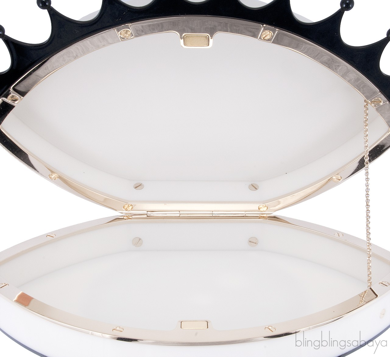 This enticing Eye Want You Clutch from Charlotte Olympia is crafted in Ivory Perspex hard case accented with pale golden hardware. This clutch features an eye-catching eye design in black and teal color with black eyelashes at top. It has the concealed magnetic fastening closure with pale gold hinge and a roomy interior for cards, keys and small belongings.