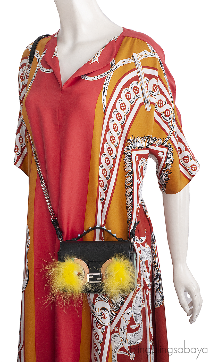 This Fendi Baguette Micro Double-Sided Monster Crossbody Bag is crafted from multicolor nappa leather accented with palladium hardware. This cute bag features a monster motif with flap magnetic closure with dyed yellow fur lashes, snakeskin leather around the eyes and signature FF logo hardware on flap. Interior is fully lined with suede with two major compartment and two card holders on one side and has wall pocket and roomy interior on the other side. This comes with spike accent top handle and long detachable chain and leather shoulder strap.