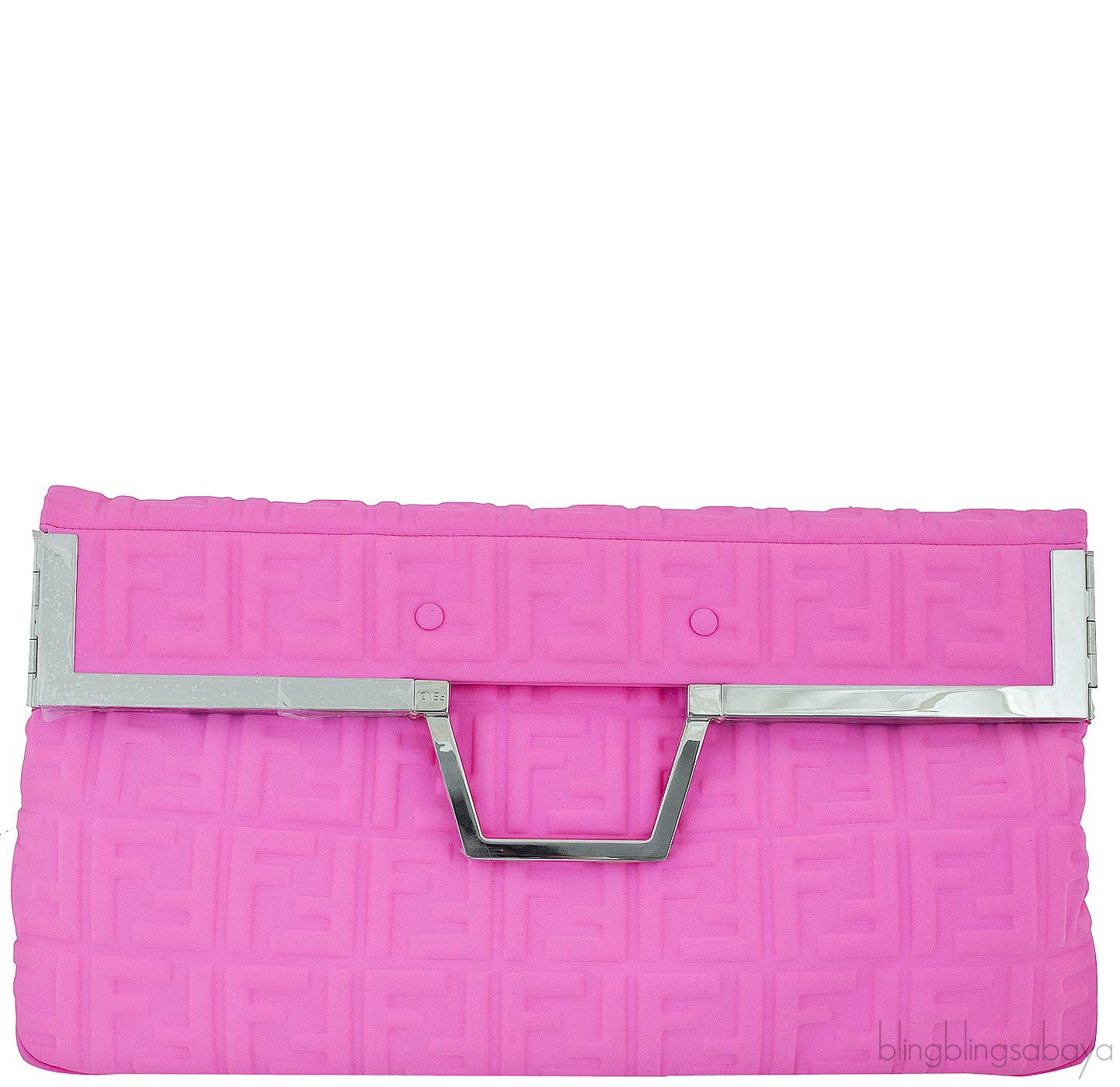 This Flat Shopping Bag Neon Pink Large from Fendi is crafted neon pink lycra fabric accented with palladium hardware. This square-shaped handbag features a rigid, double handle and metallic closure and FF logo embossed allover. The soft design allows the bag to be folded to be carried in the hand. Interior is lined with coordinating pink leather with no pocket.