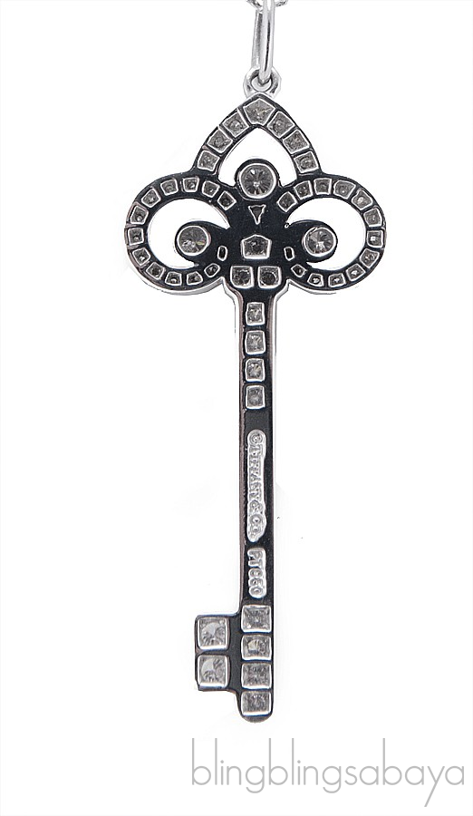 Unlock your elegant look with this gorgeous Tiffany & Co. Fleur de Lis Key Pendant. Crafted in platinum metal set with precious round brilliant cut diamonds, impressively pair with 18kt white gold link chain from Tabbah that measures approx. length of 38 cm / 15 inches.