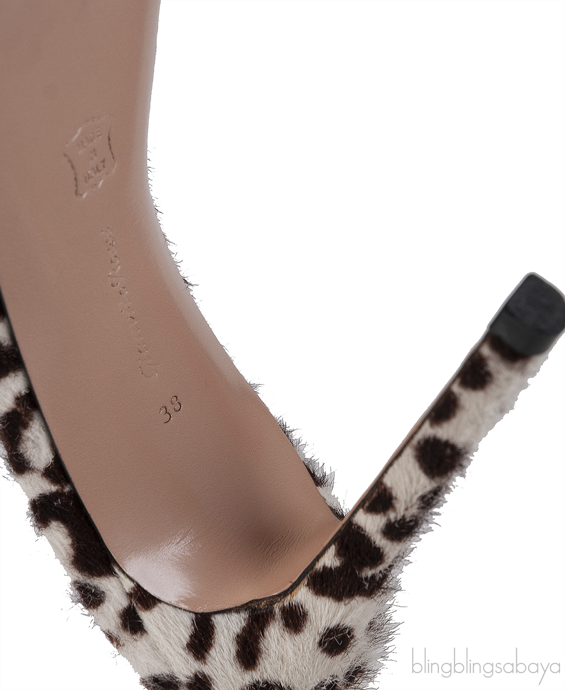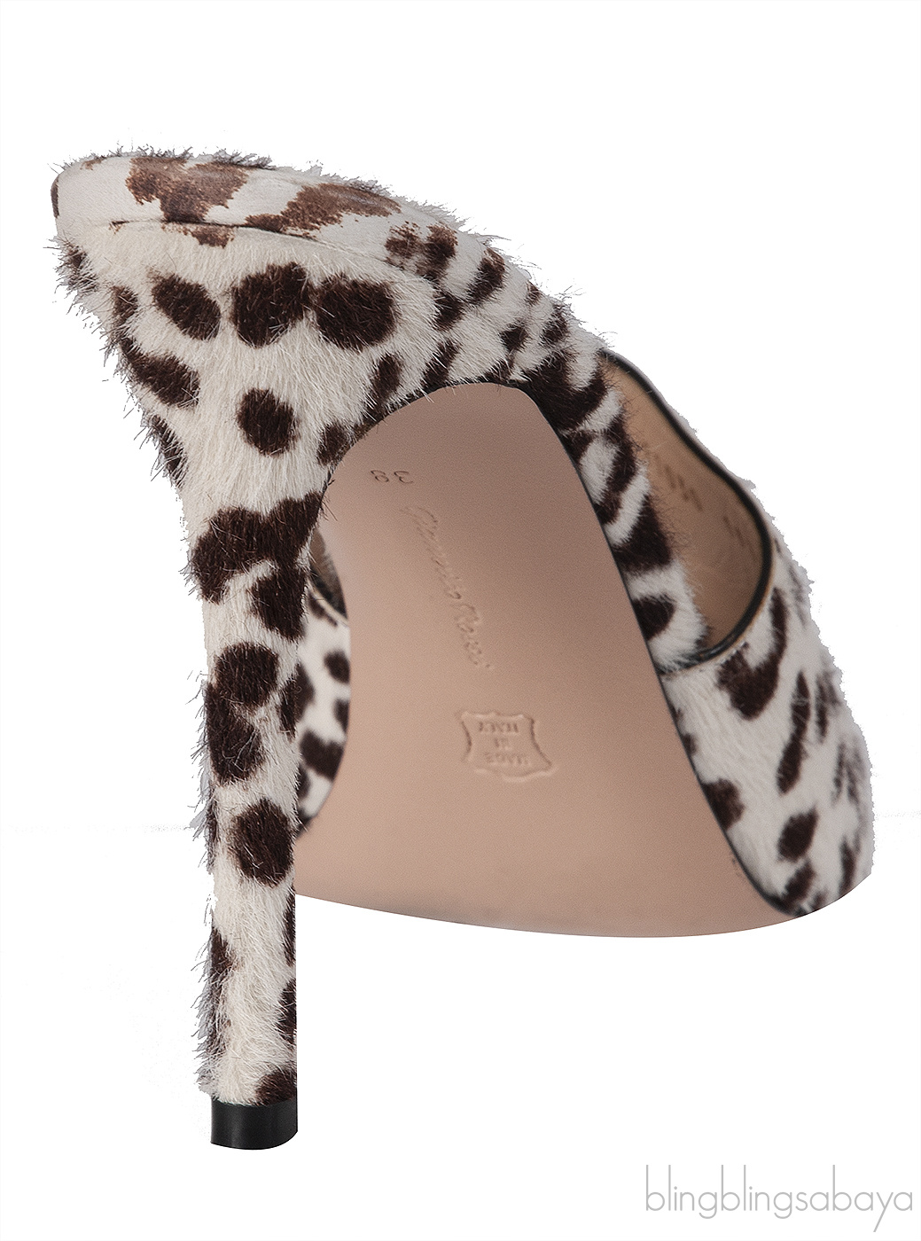 These Alice Leopard Print Calf Hair Mules from Gianvito Rossi are made calf hair upper with nude leather lining. These mules feature a slip-on style, peep pointed toe, leather lined insole, leather lined sole and heels measuring 110 mm high.