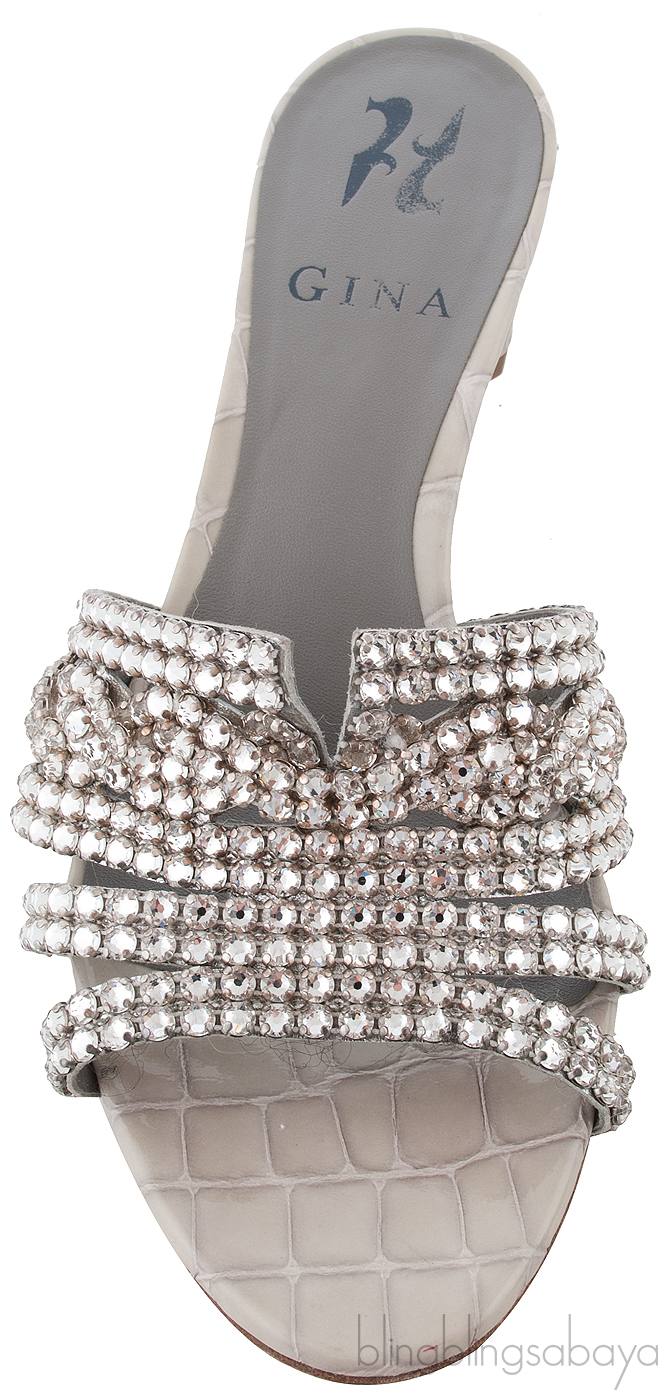 These Galaxy Croc Embossed Off-white Heeled Sandals from Gina are made of silver leather upper decorated with sparkling silver Swarovski crystals. These sandals features a leather lined insole, crocodile embossed leather trimming,leather covered heels measuring 50 mm high and leather lined sole.