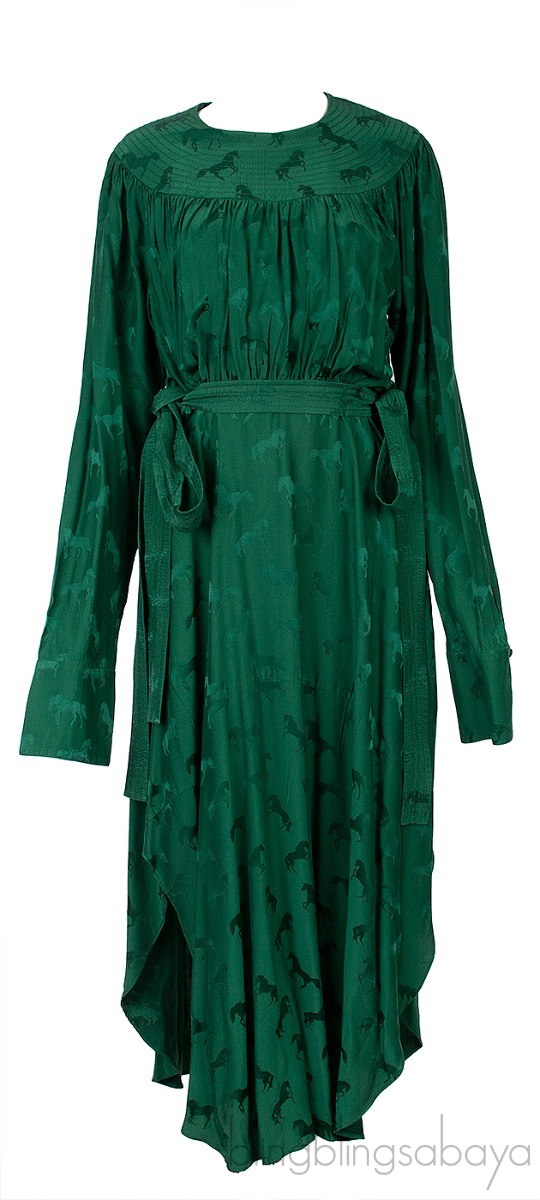 This Green Horse Print Gathered Front Dress from Stella McCartney is crafted in 53% Viscose and 47% Silk in emerald green hue with horse print all-over. This dress features a round neckline, button fastening at rear, long-sleeves, overlay design at top with with self-tie fastening at waist, side slits and oval hemline.