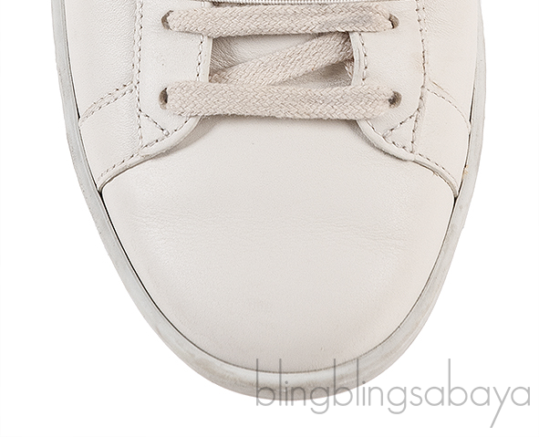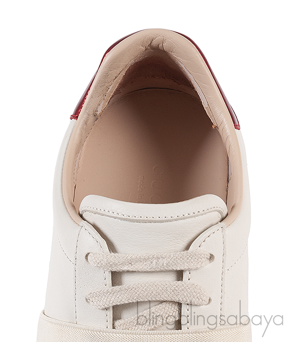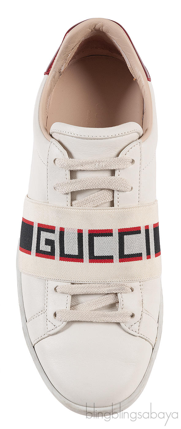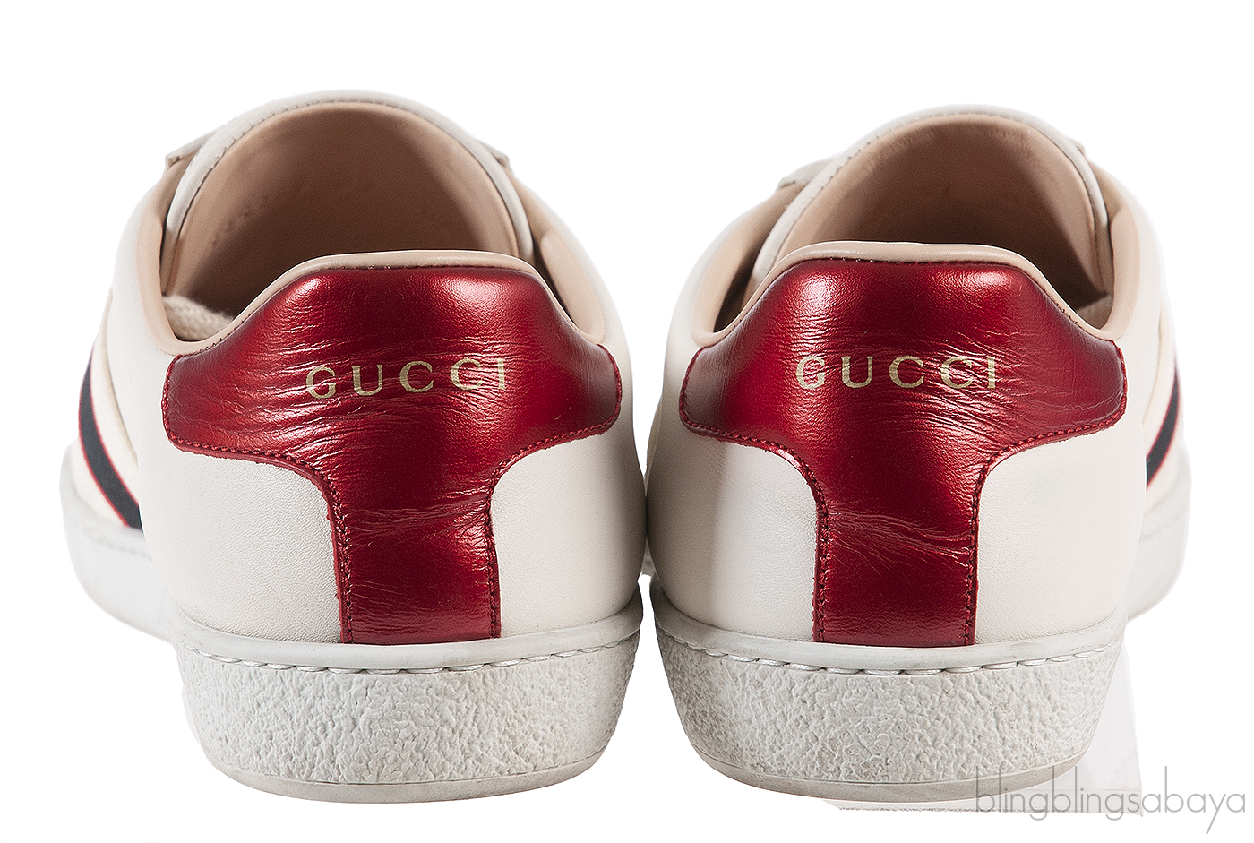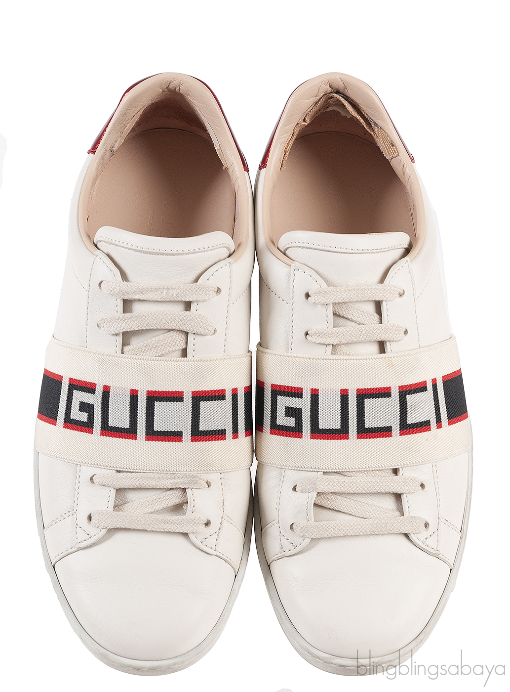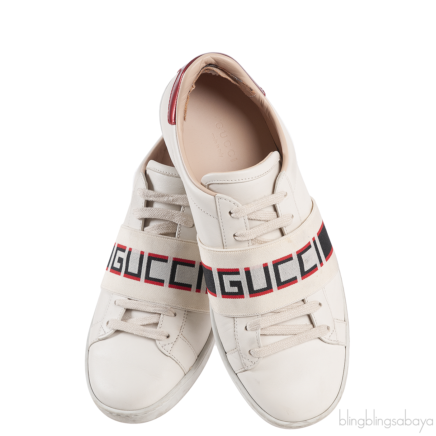 These Ace Leather Sneakers from Gucci are crafted from smooth white calf leather with tonal lace-up closure. These shoes features a low-cut design with label\'s logo jacquard stripe across the vamp, red metallic heel counter leather lining, and rubber sole