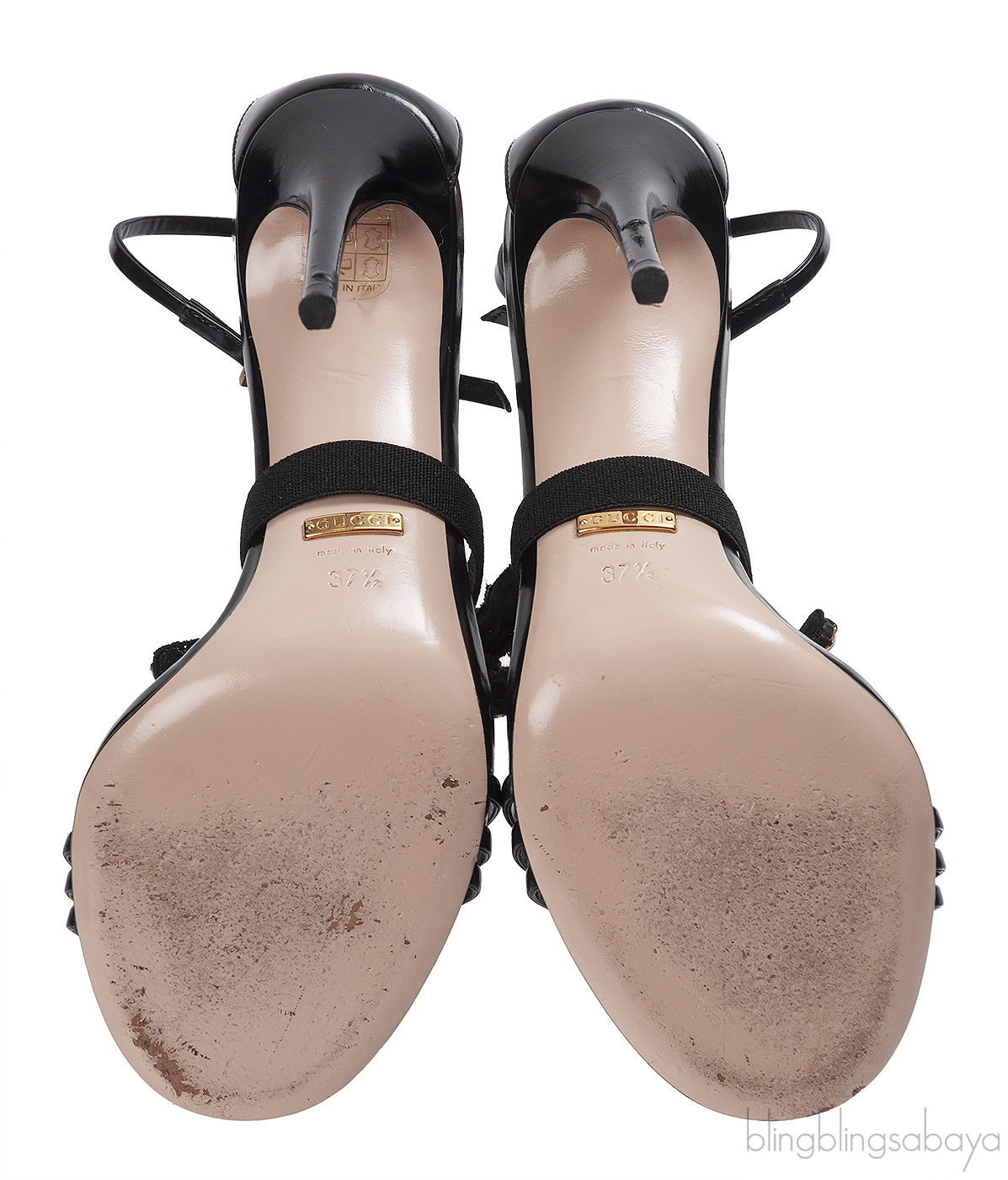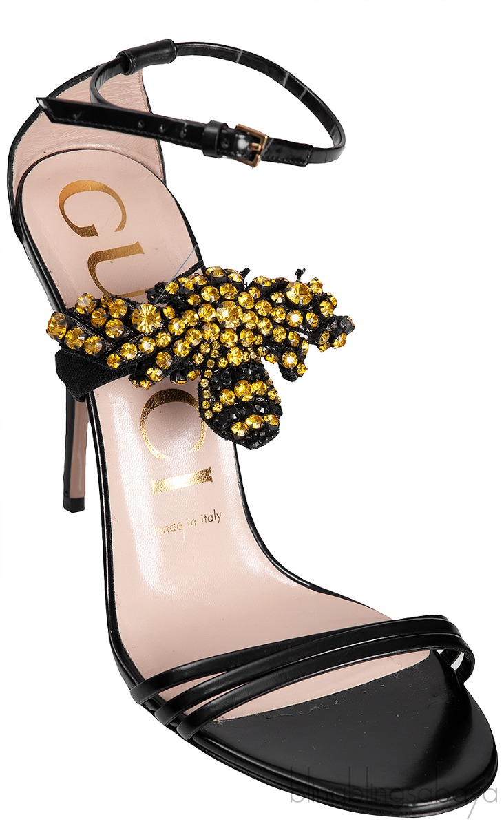 This Black Bee Embellished Crystal Sandals from Gucci is crafted from black patent leather and nude leather lining. These sandals features a three leather straps at vamp, peep almond tow, slingback with gold fastening, stiletto heels measuring 100 mm high, leather lined sole, optional black elastic strap with embellished crystal bee.