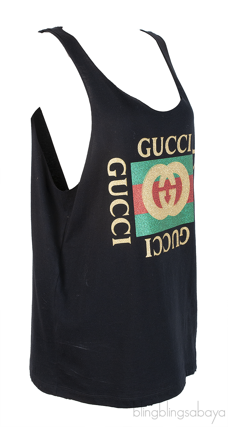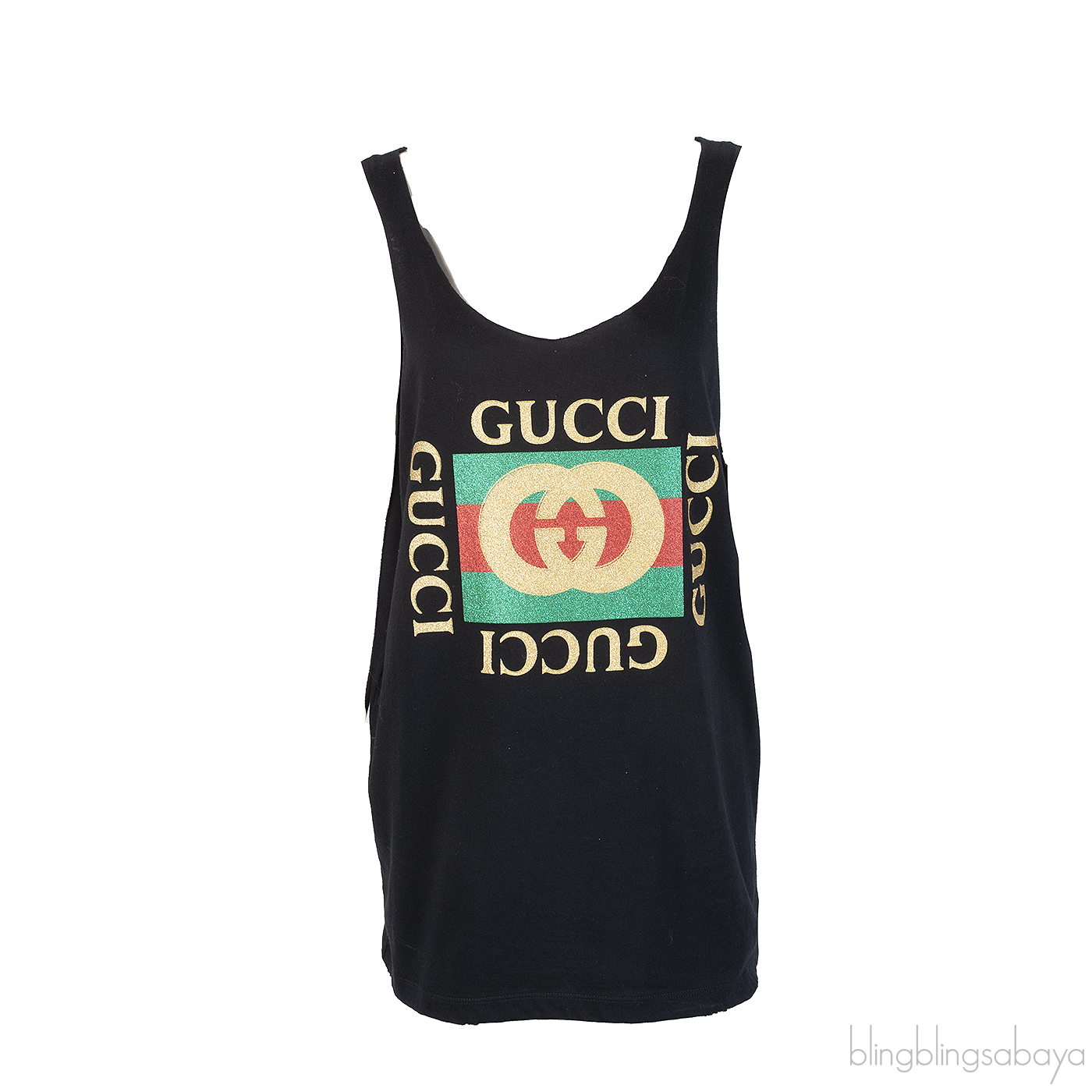 This Gucci Black Vintage Printed Tank Top from Gucci is crafted from black soft comfortable printed fabric featuring a scoop neckline, sleeveless, pull-over, and brand and interlocking G print at front.