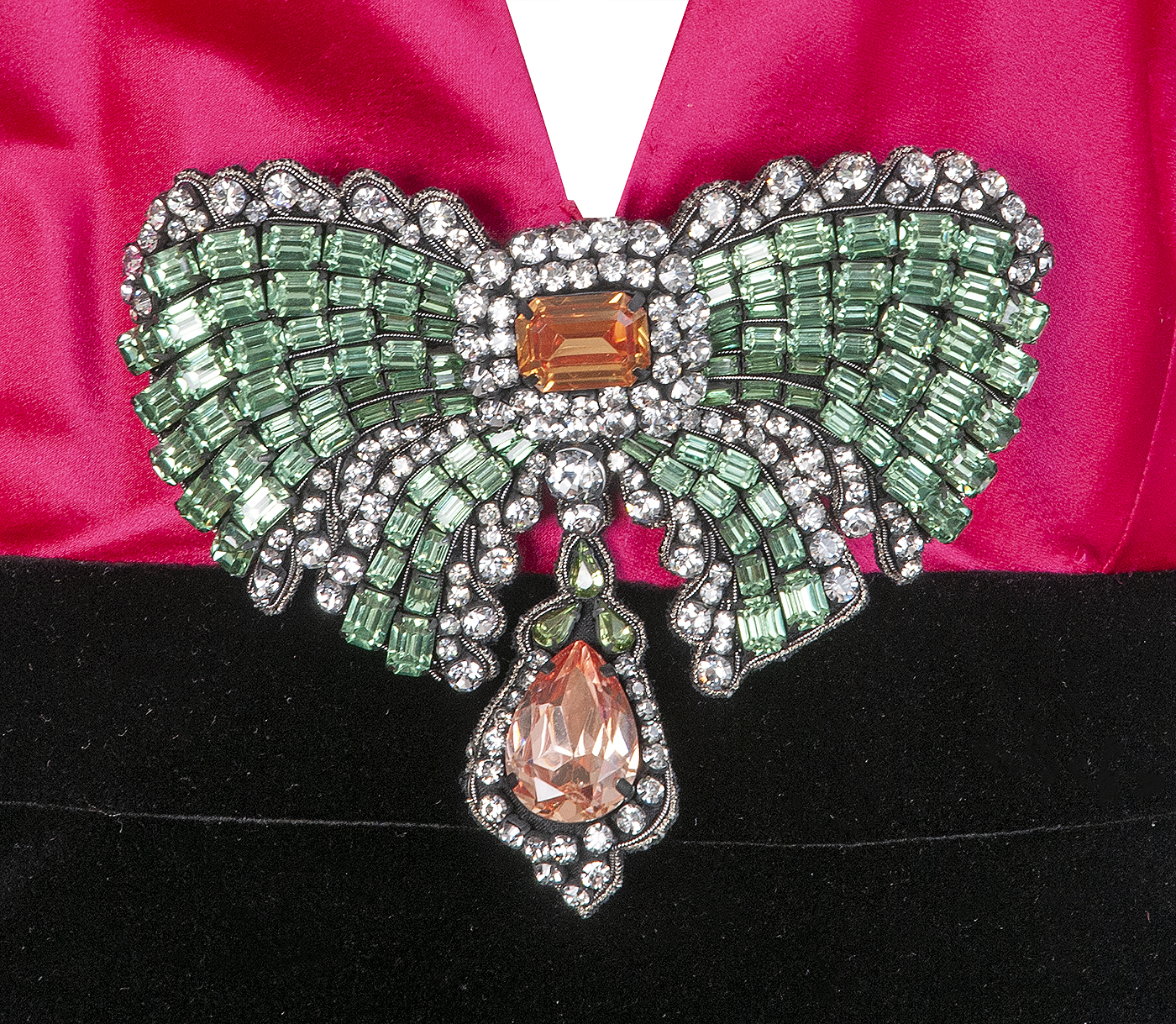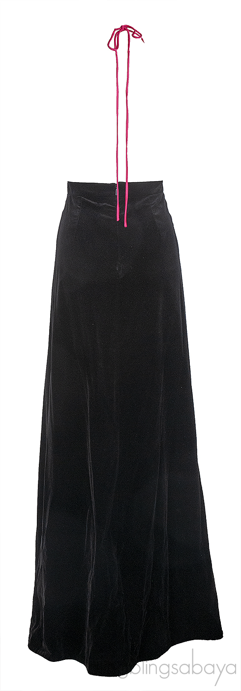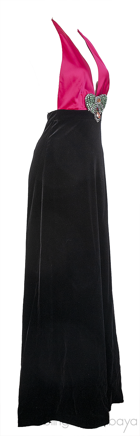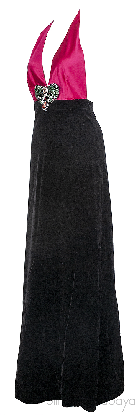 This Gucci Fuchsia Pink Cotton and Black Velvet Gown features a halter top with deep v-neckline, sleeveless, back zip closure and maxi length. This gown comes with detachable crystal embroidered bow applique on the waistline