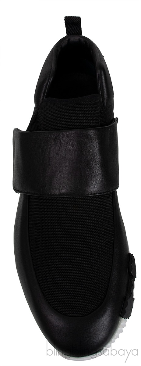 This pair of H Sneaker from Hermes is crafted in calfskin leather and stretch canvas in black hue. This shoes features an almond toe, leather lined insole, leather strap across the vamp with velcro fastening and light sole with graphic design in white rubber.