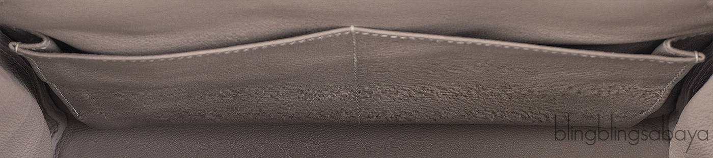 The interior is lined in luxurious grey leather and thoughtfully designed with one zip pocket and two open pockets, offering both beauty and functionality.