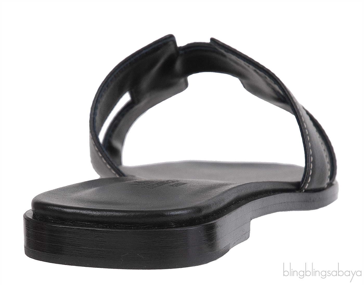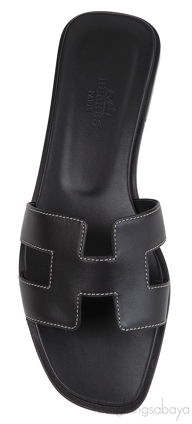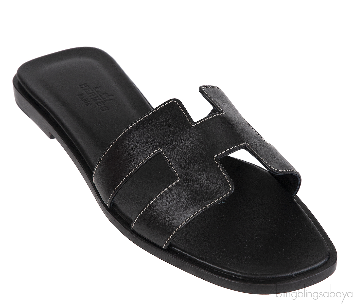 This pair of Hermes Oran Black Box Leather Sandals is crafted in Box Leather with contrasting white stitching. The Hermes "H" shaped Leather design adds signature detail at the vamp. Leather lining and cushioned insole with the Hermes named embossed on heel pad. This sandal is easier to try on or pull-off, it is also soft so it is comfortable to wear and easy to walk in!