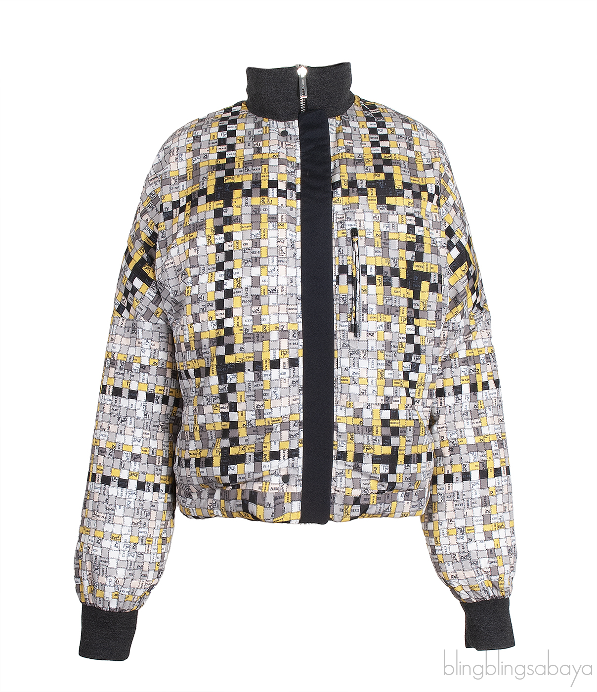 This Hermes Reversible Black and Printed Bomber Jacket is crafted from 100% Polyester exterior fabric and in plain black and multicolor on reverse. This features a small square tiles arranged like a mosaic print each squares features hermes motifs . This jacket features middle front fastening with zip and pull-tab, high collar in black and grey rib trim on reverse, pockets, long sleeves with rib cuffs.