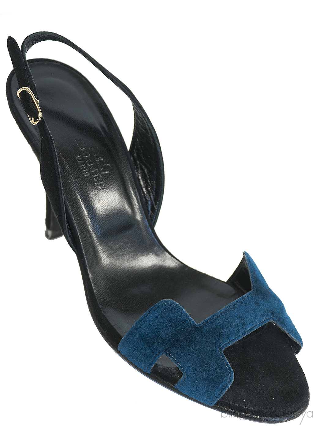 This Bi-color Night 90 Slingback from Hermes is crafted in bi-color suede leather with tonal stitching. This slingback sandals features a an iconic "H' vamp in blue green hue, permabrass buckle in black slingback, round toe, black leather lining has comfortable heels measuring 90 mm
