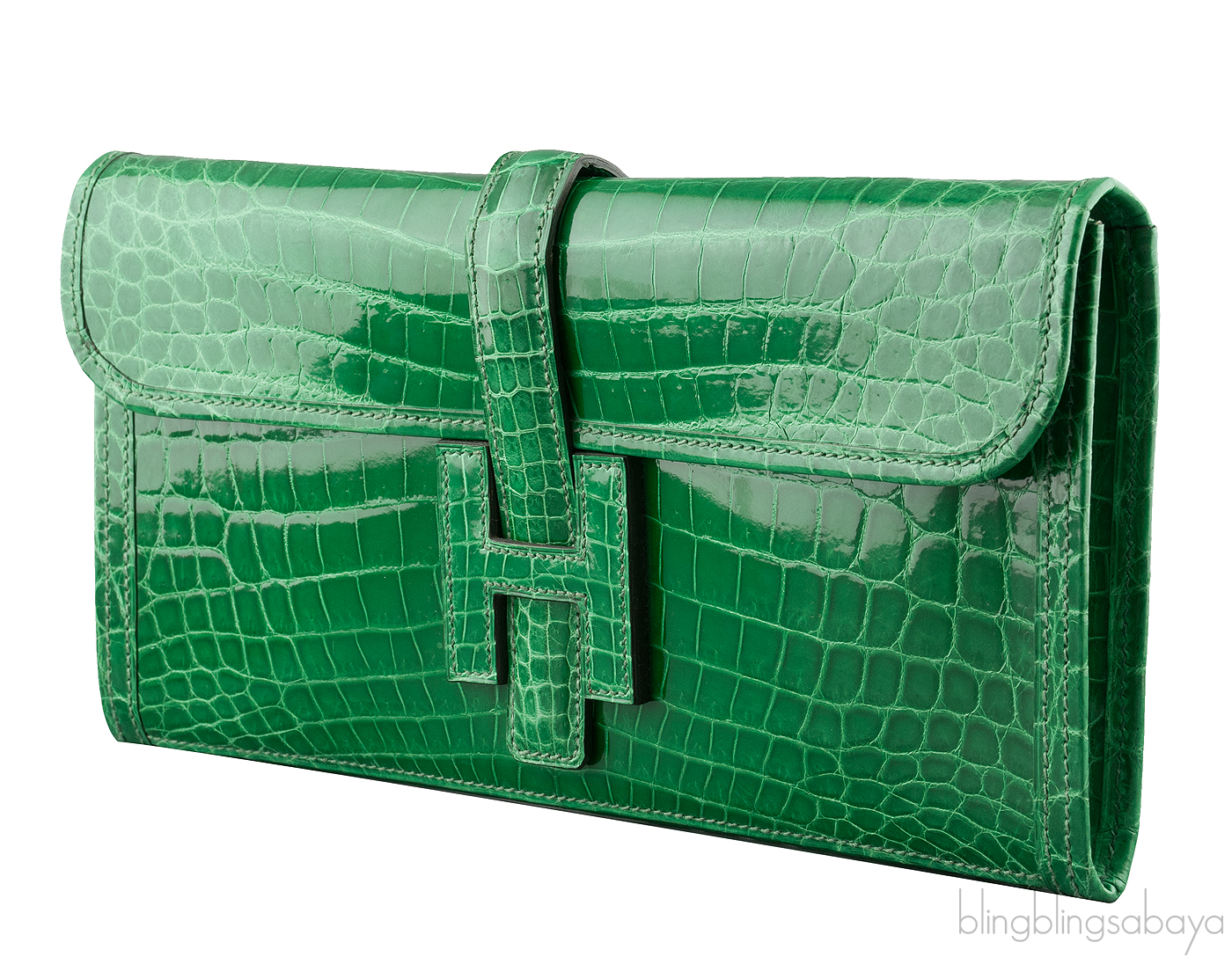This so popular and stunning luxury Clutch of Hermes is made of exotic Niloticus Crocodile Skin in stunning patent emerald green color. It features a flap closure that folds securely into the iconic "H" front logo with an intricate stitching and has a roomy interior.
