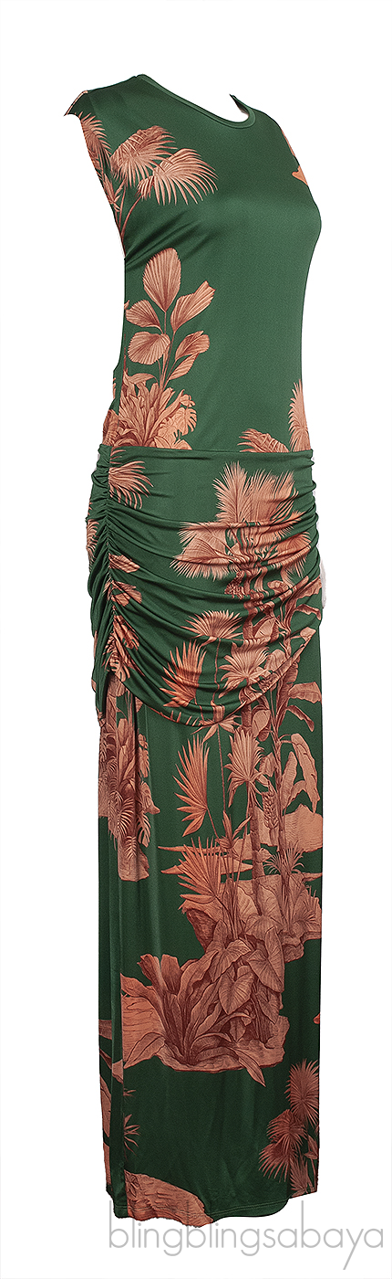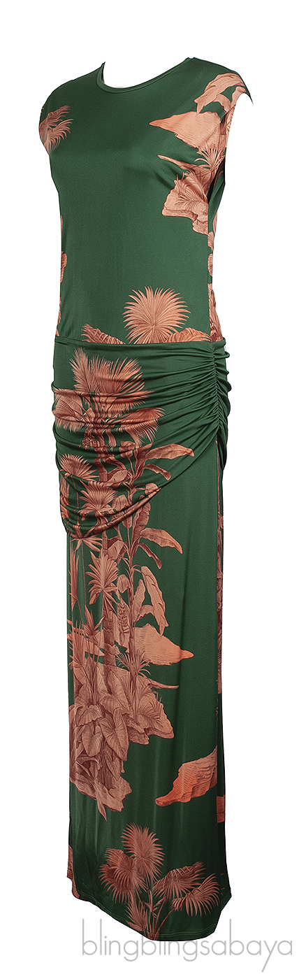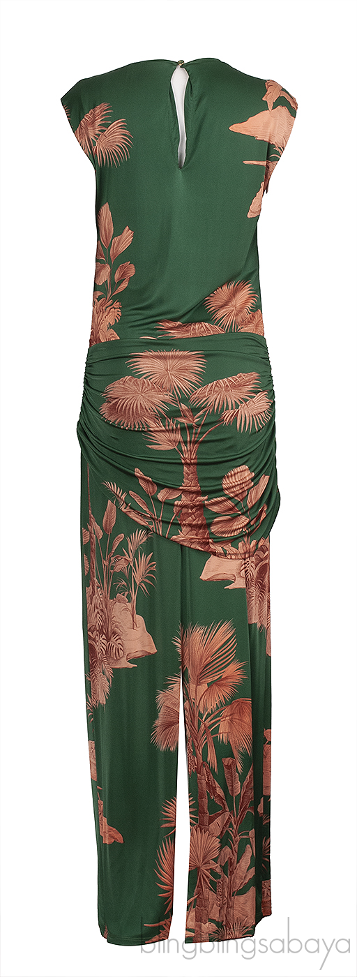 This Johanna Ortiz Finding The Way Floral Maxi Dress is crafted from 96% viscose, 4% elastane. This midweight jersey dress in green features a round neckline, sleeveless, ruched fabric at waist, back button closure, partially lined and ankle length.