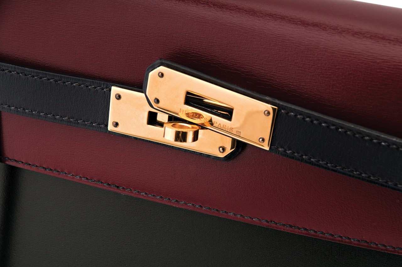 This definitely different and really stands out vintage Kelly 32 is in a box leather in three different iconic colors of Hermes- red, navy blue and bottled green.