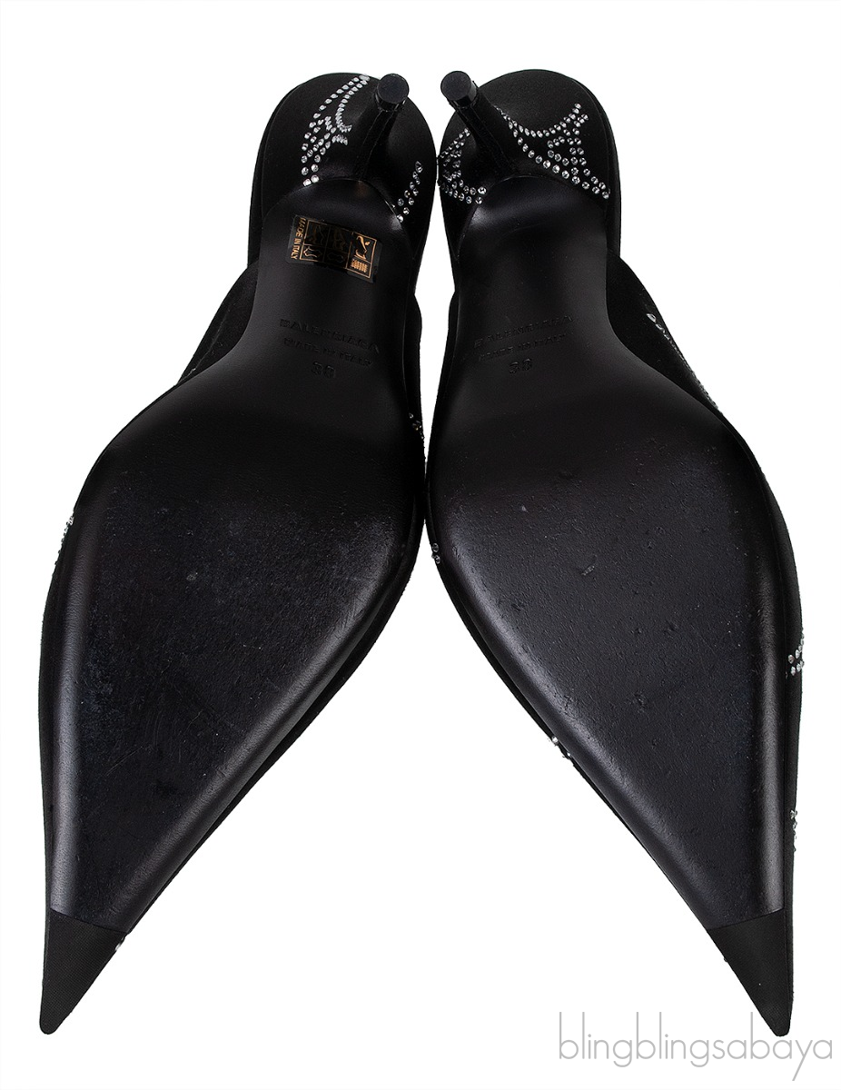 These Knife Black Eiffel Tower Crystal Mule from Balenciaga are crafted from black satin upper with black leather lining. These mules features a sharp pointed toe, crystal embellished eiffel tower motif at vamp, leather lined insole and sole, and heels measuring 80 mm high.