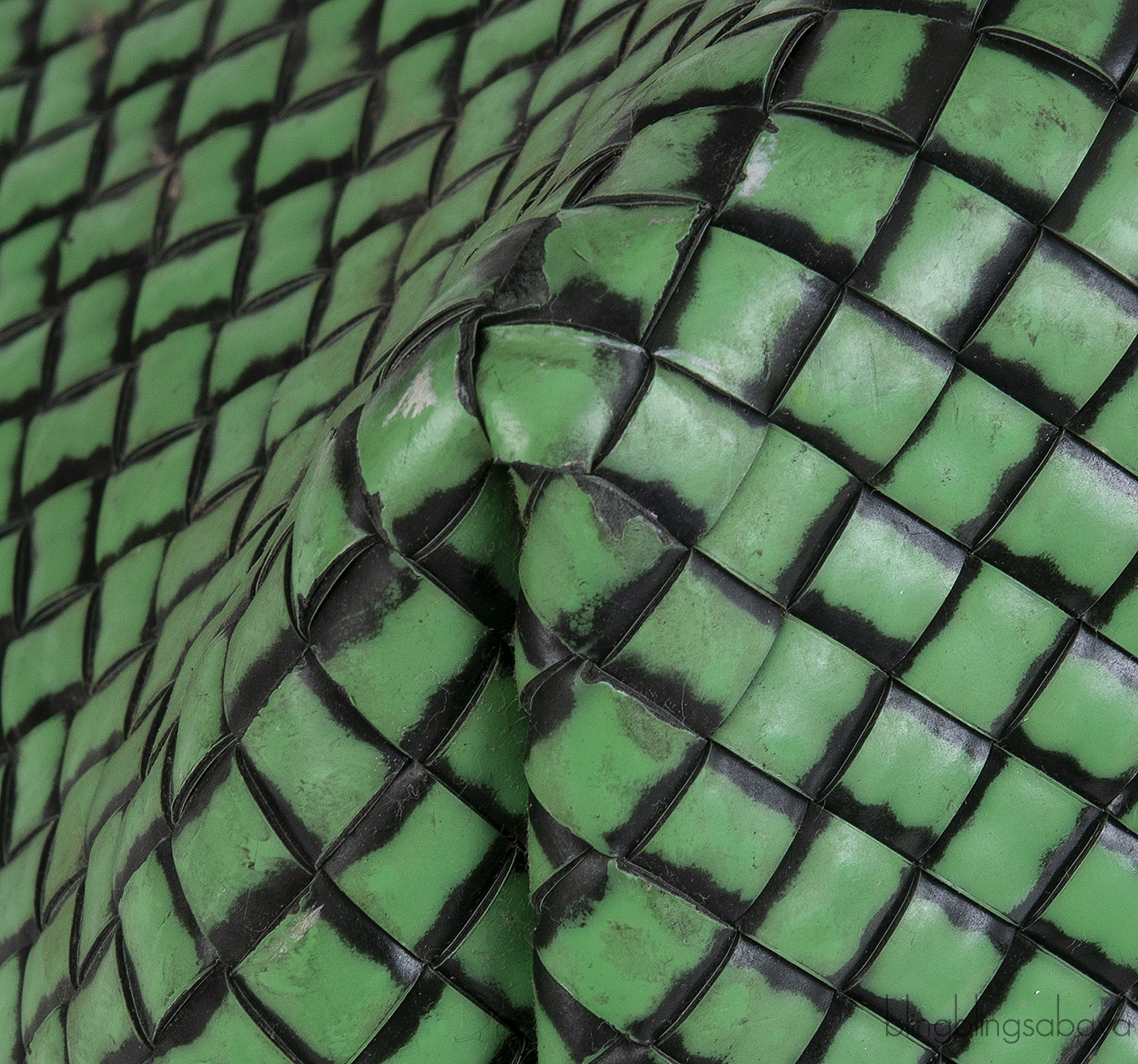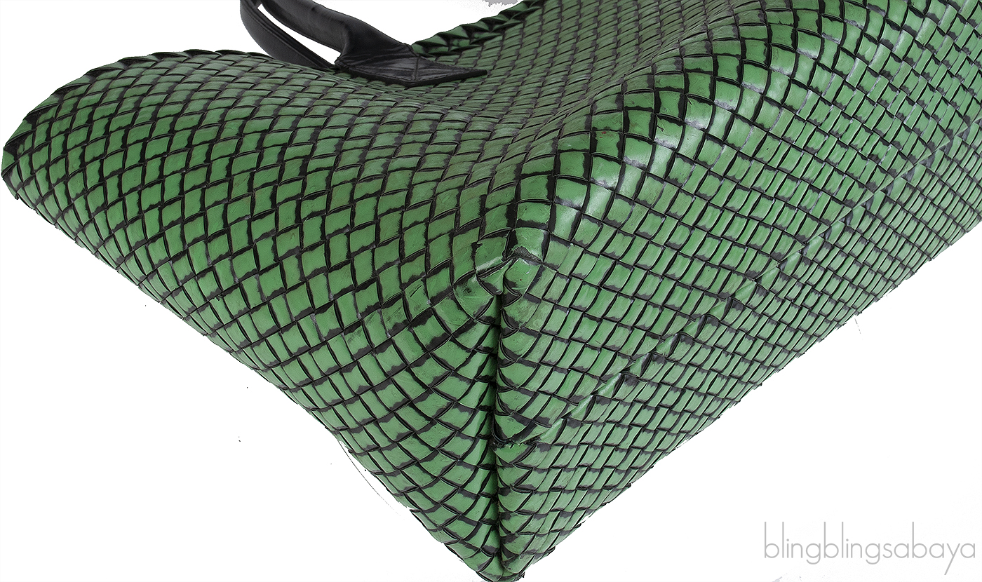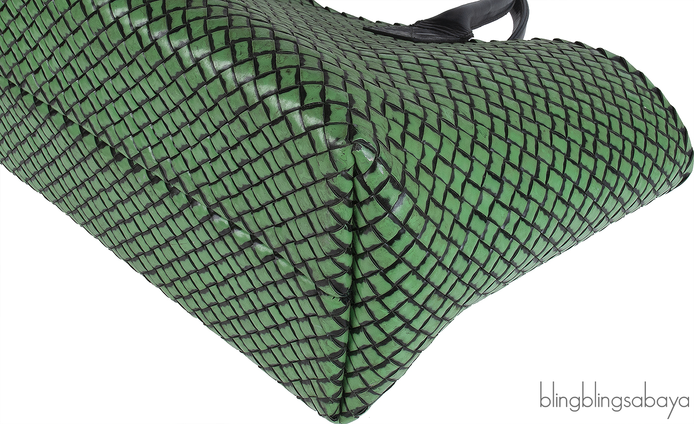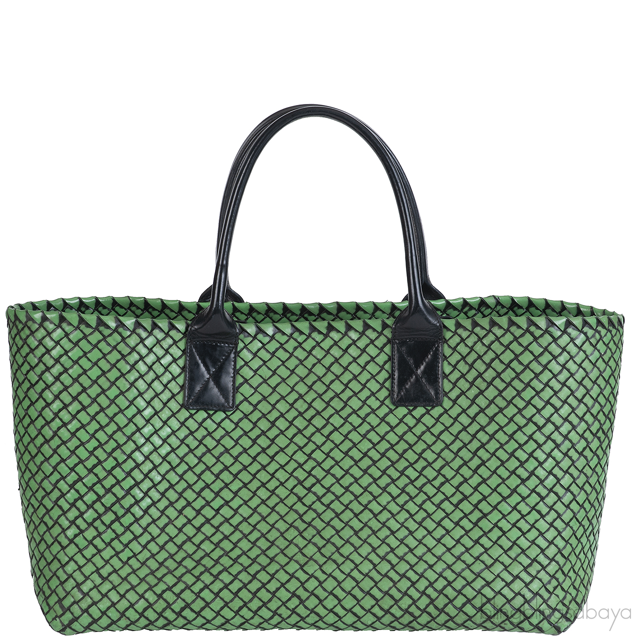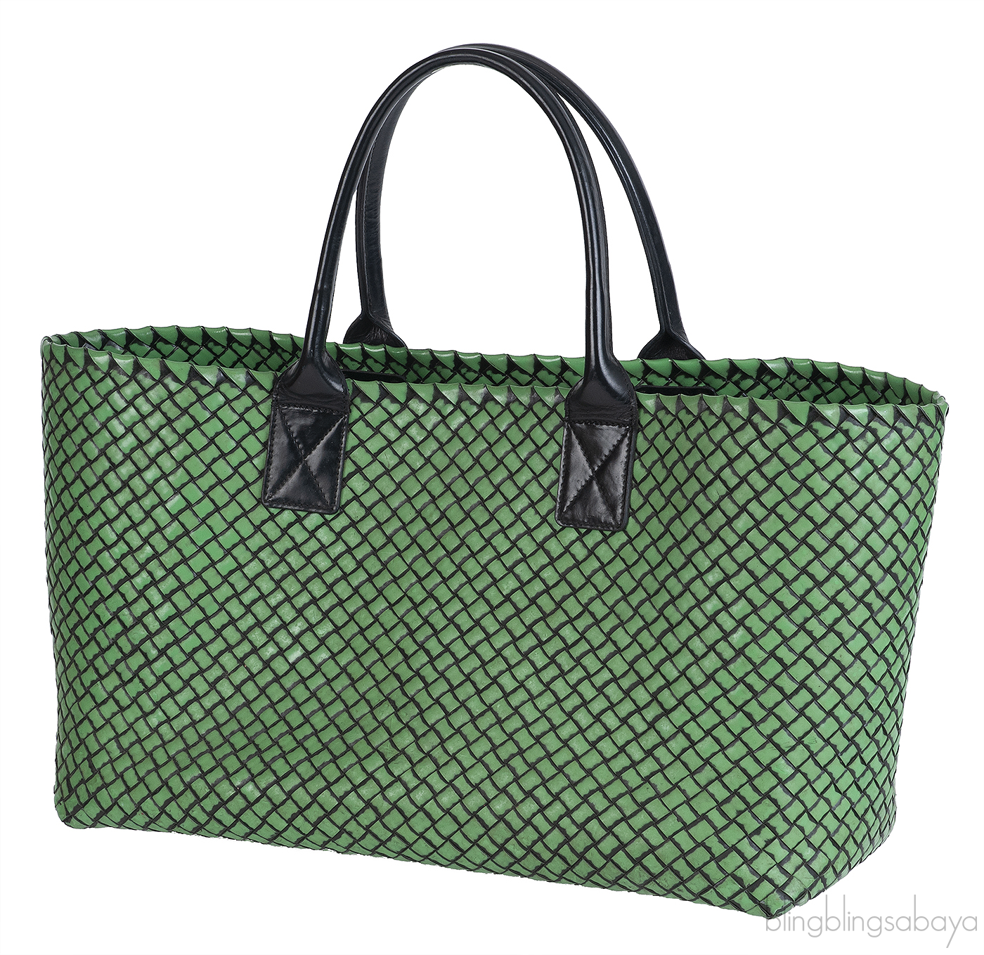 This La Esperanza Intrecciato Cabat Bag from Bottega Venetta is luxuriously crafted of tightly woven glossy vinyl in green with brushed black edges This so limited double face bag features two rolled leather handles and an open top. This very versatile piece has a very roomy interior good enough to carry your daily essentials.