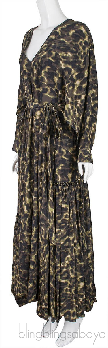 This Leopard Print Dark Green Dress from Stella McCartney is crafted from 100% Silk fabric with leopard print all-over features an oversize design, open longsleeves with button cuffs, self tie fastening at waist and maxi length.