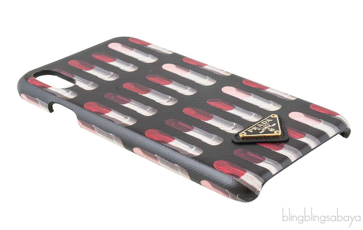 Cover your iPhone with this stylish Lipstick Iphone XS Case from Prada. This case is crafted in black saffiano leather featuring a fancy Lipstick print design. Fits iPhone XS Max!