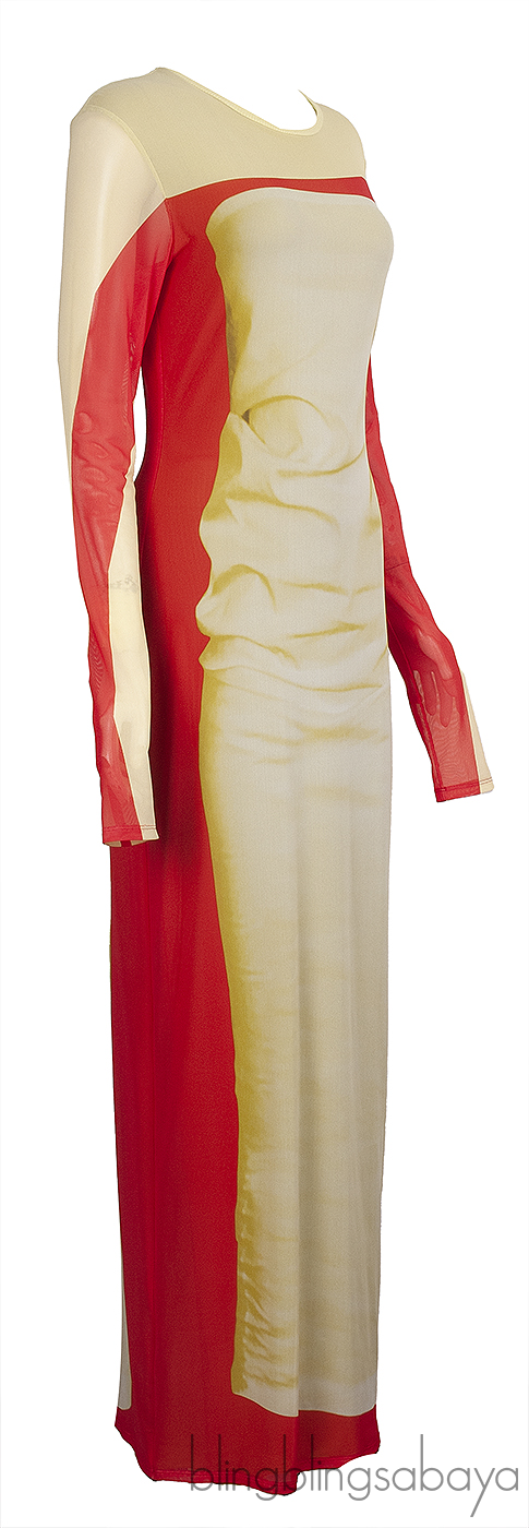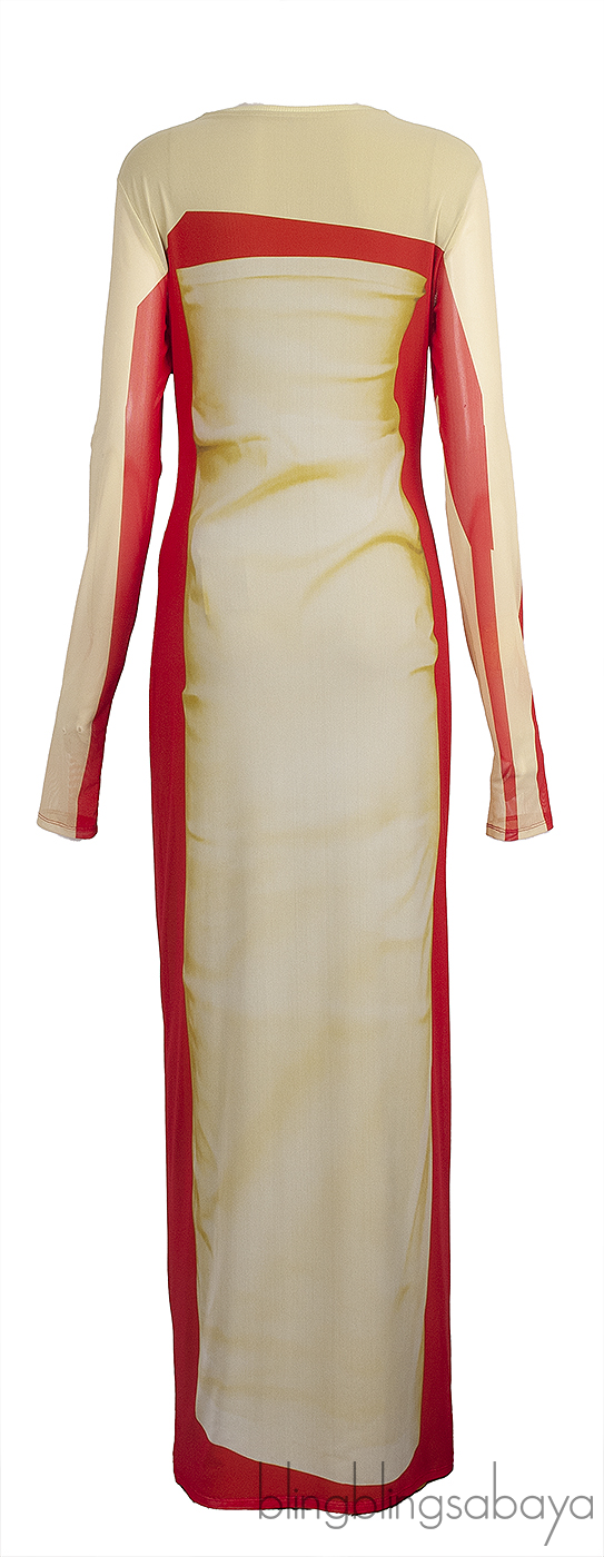 The Loewe Trompe L'Oeil Amarillo Stretch Tube Maxi Dress is made from a blend of 85% polyamide and 15% elastane, with a lining composed of 96% viscose and 4% elastane. This dress showcases a stretchy, semi-sheer design in vibrant yellow and red tones, highlighted by a trompe l'oeil print. It features a round neckline, long sleeves, and a straight hem for a sleek silhouette.