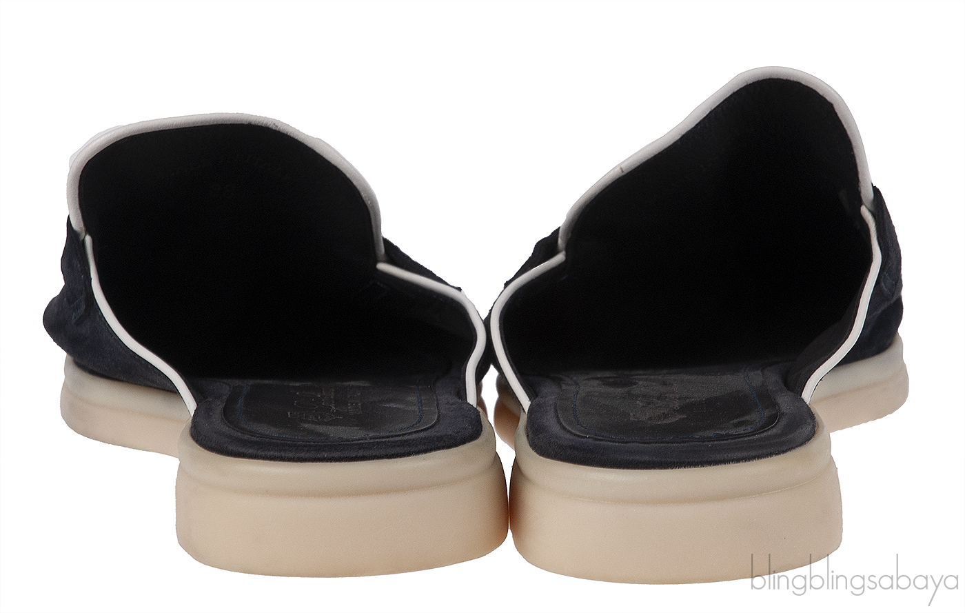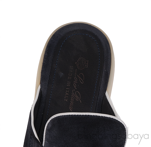 This pair Loro Piana Charm Walk Babouche Suede Black Mules expertly crafted from unlined suede with a light water-repellent and stain-resistant finish, it offers both elegance and practicality. The design is enhanced by a contrasting white leather piping and signature band adorned with Loro Piana My Charms , while the leather insole and flexible rubber sole ensure exceptional comfort and ease of wear.