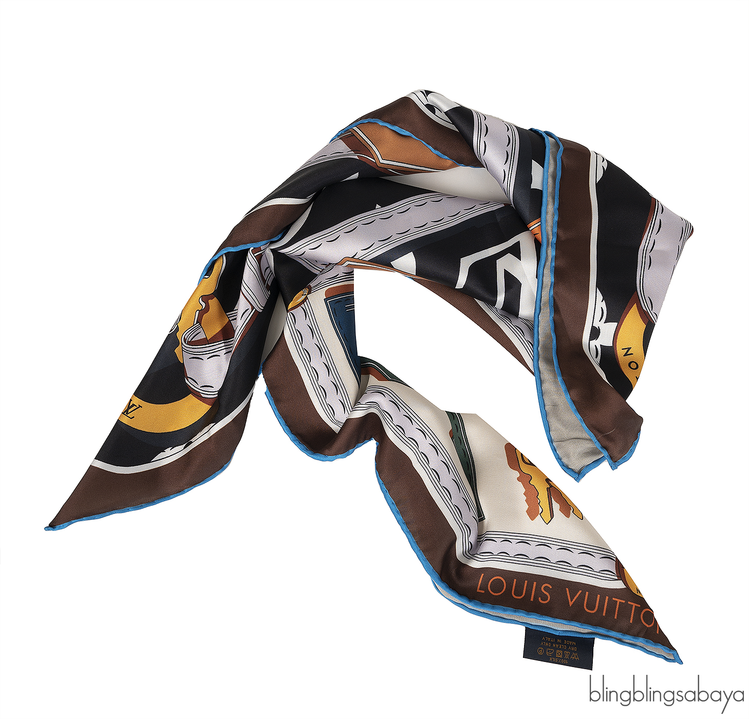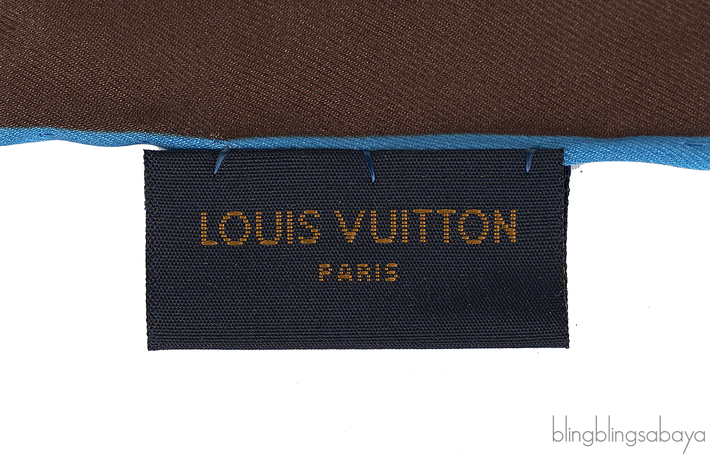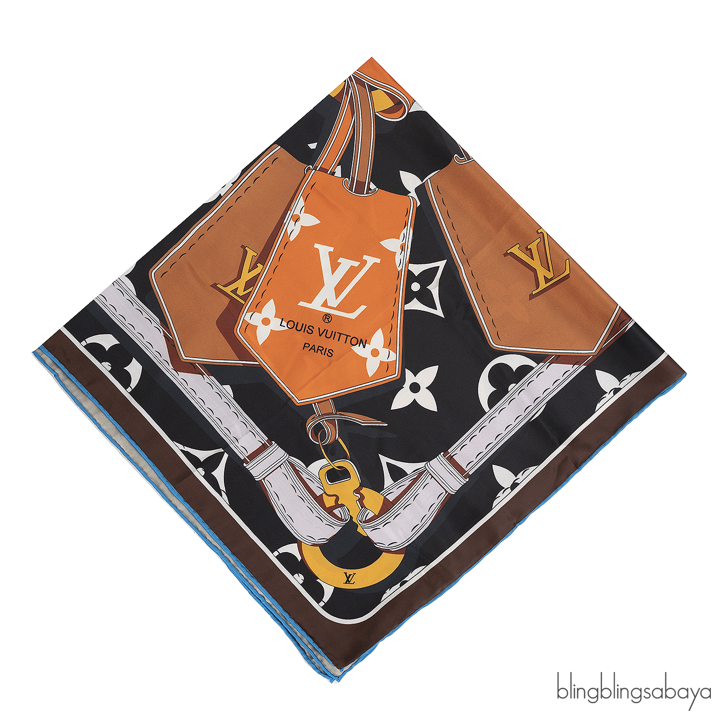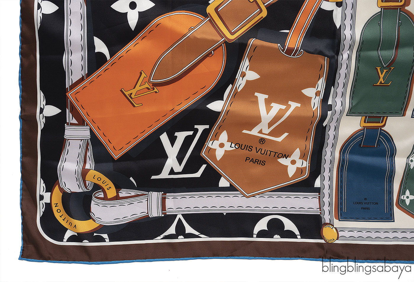This Louis Vuiton Printed Scarf is crafted from 100% Silk fabric. This scarf features a multicolor luggage tag print motif, monogram print with a brown frame and rolled edges .