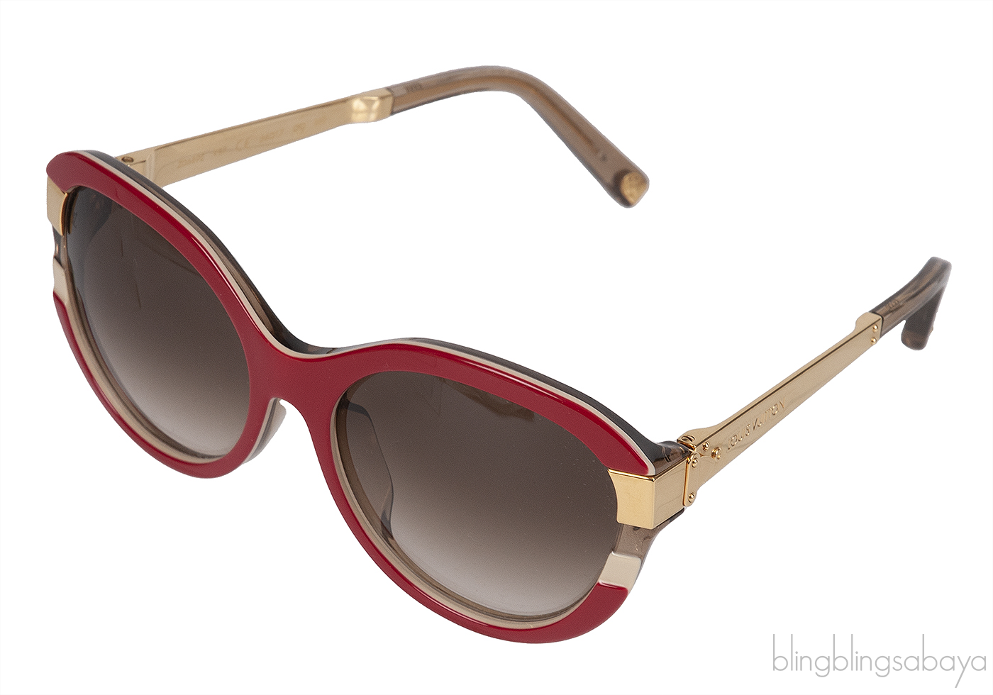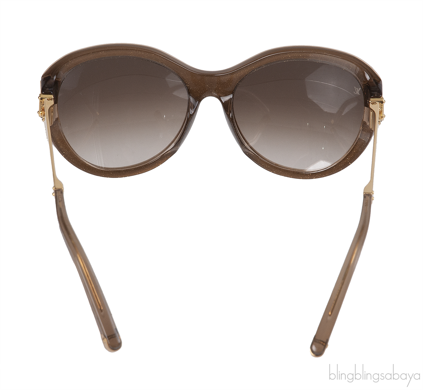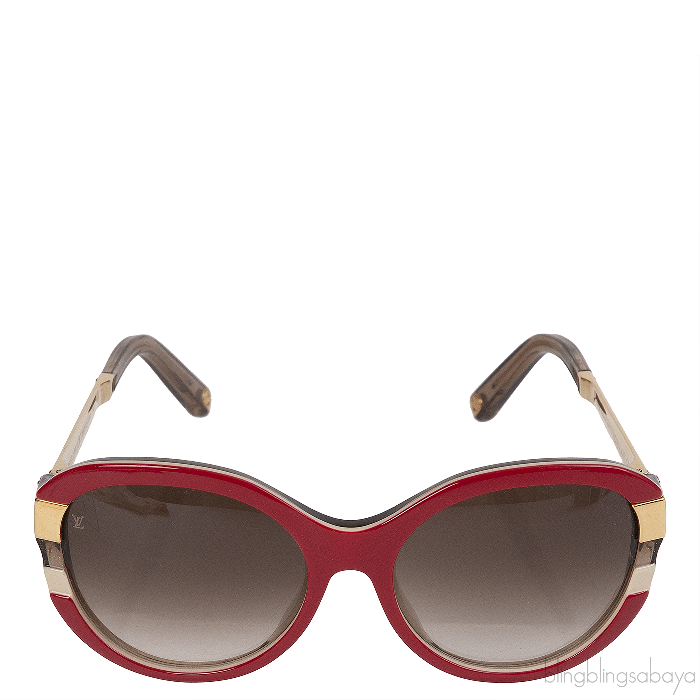 This Z0689E Soupon Cat-eye Sunglasses from Louis Vuitton features a three layered acetate frame in glittery brown, beige and red color. It has logo engraved in gold metal hands and gradient color effect lenses.