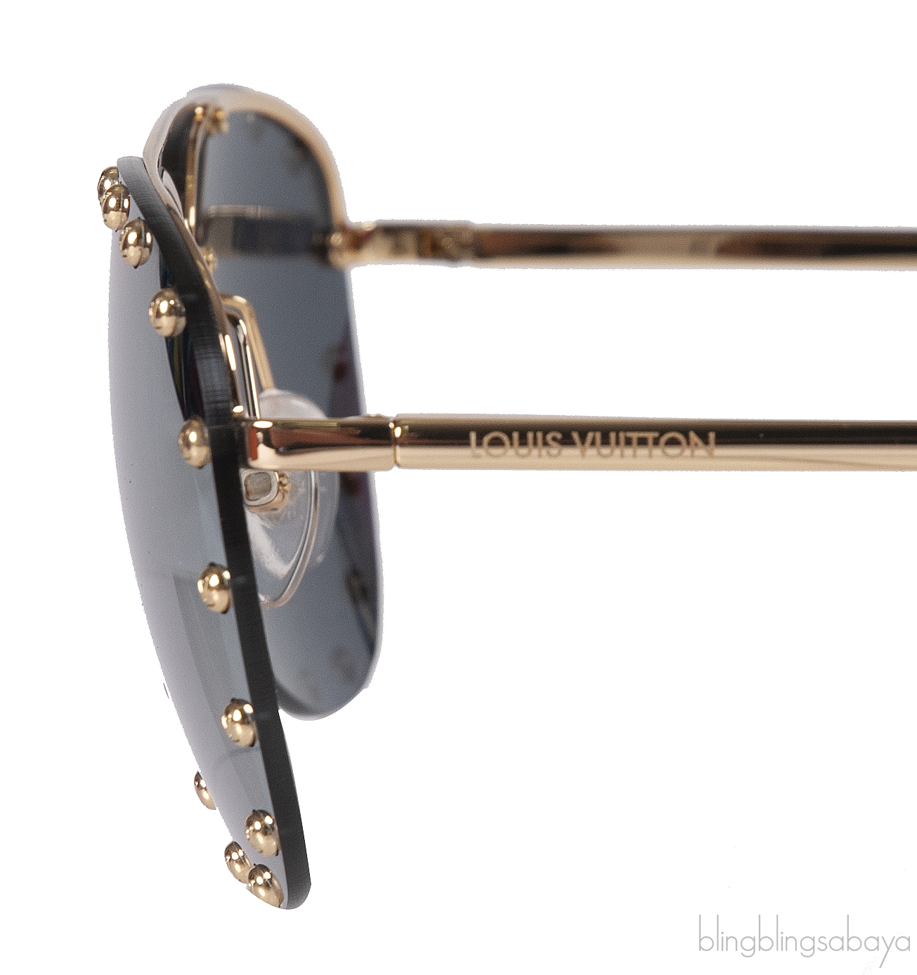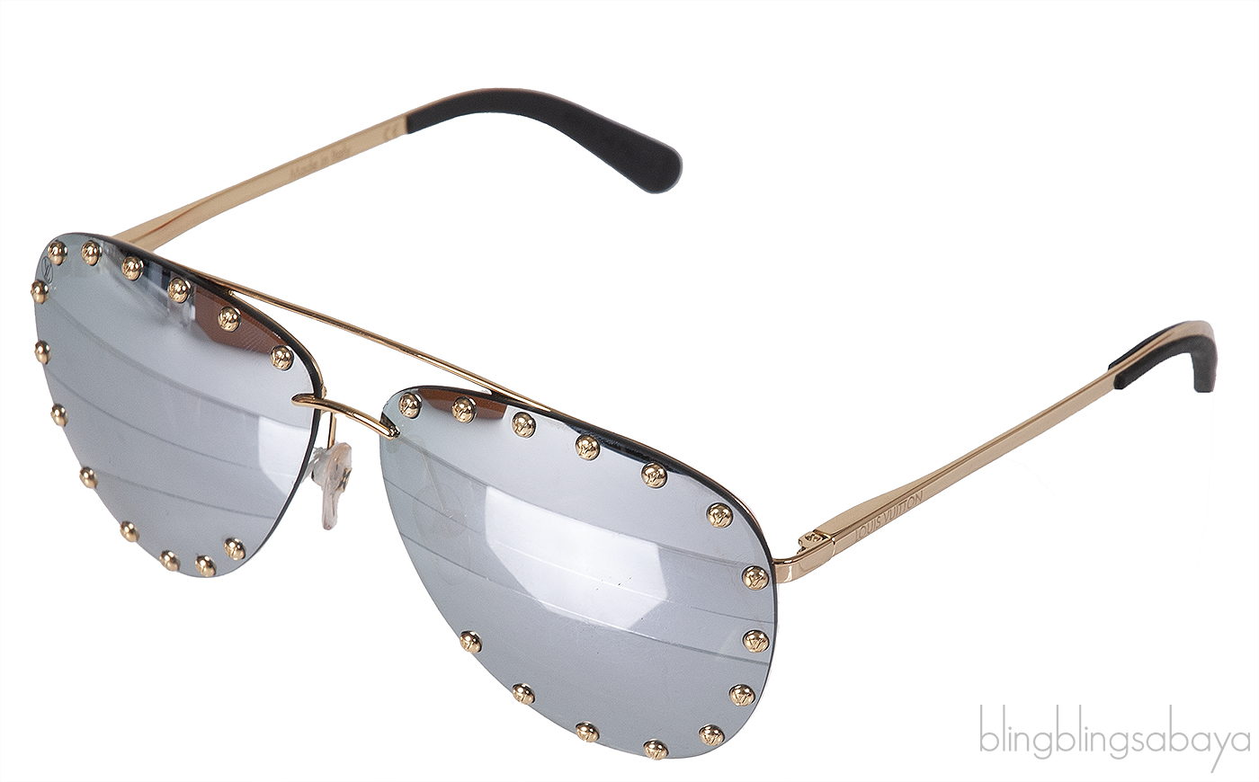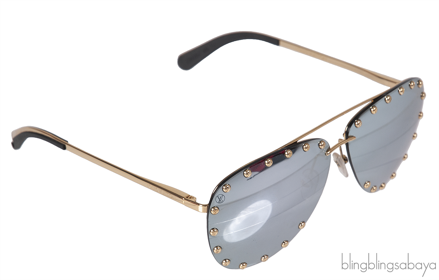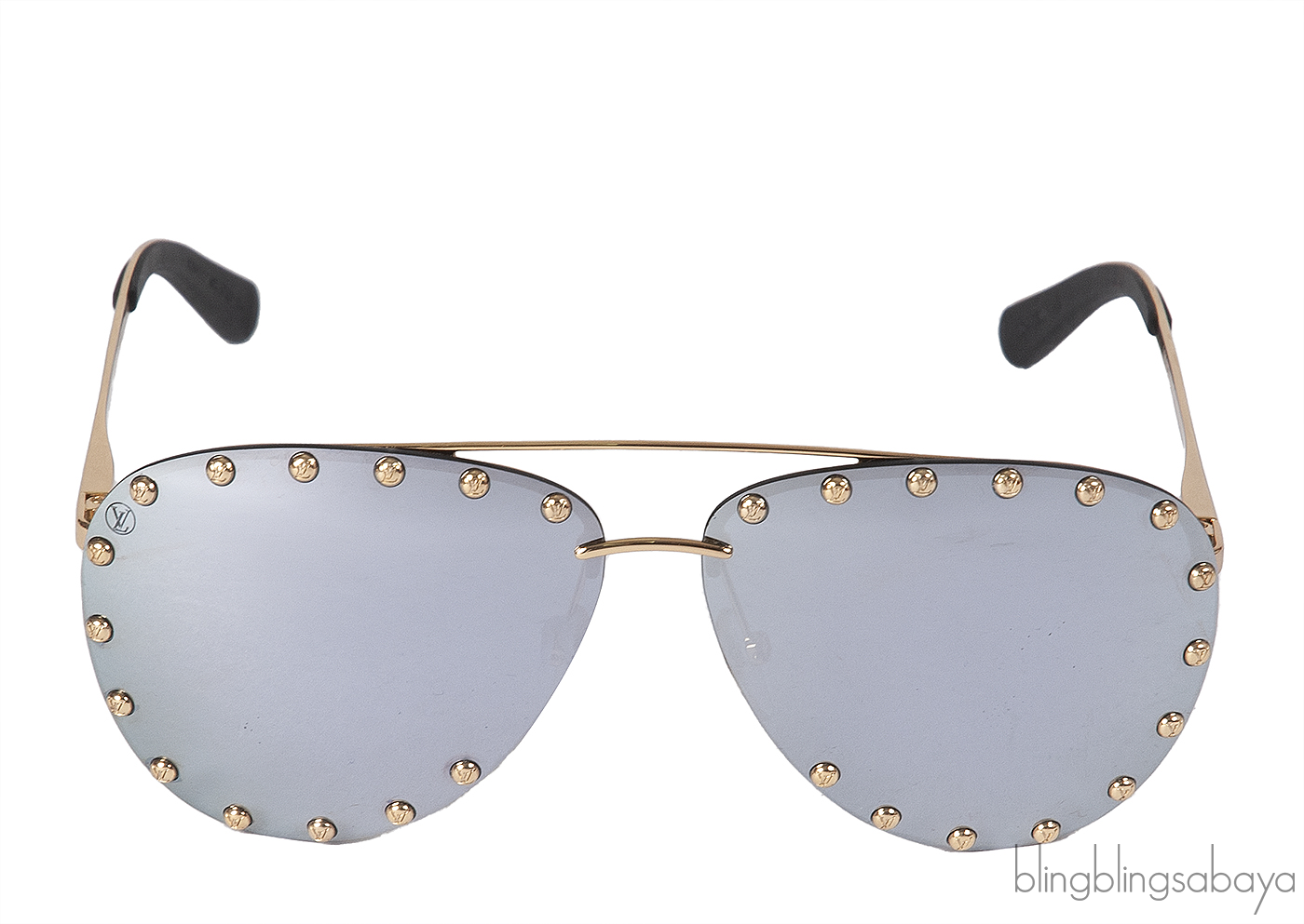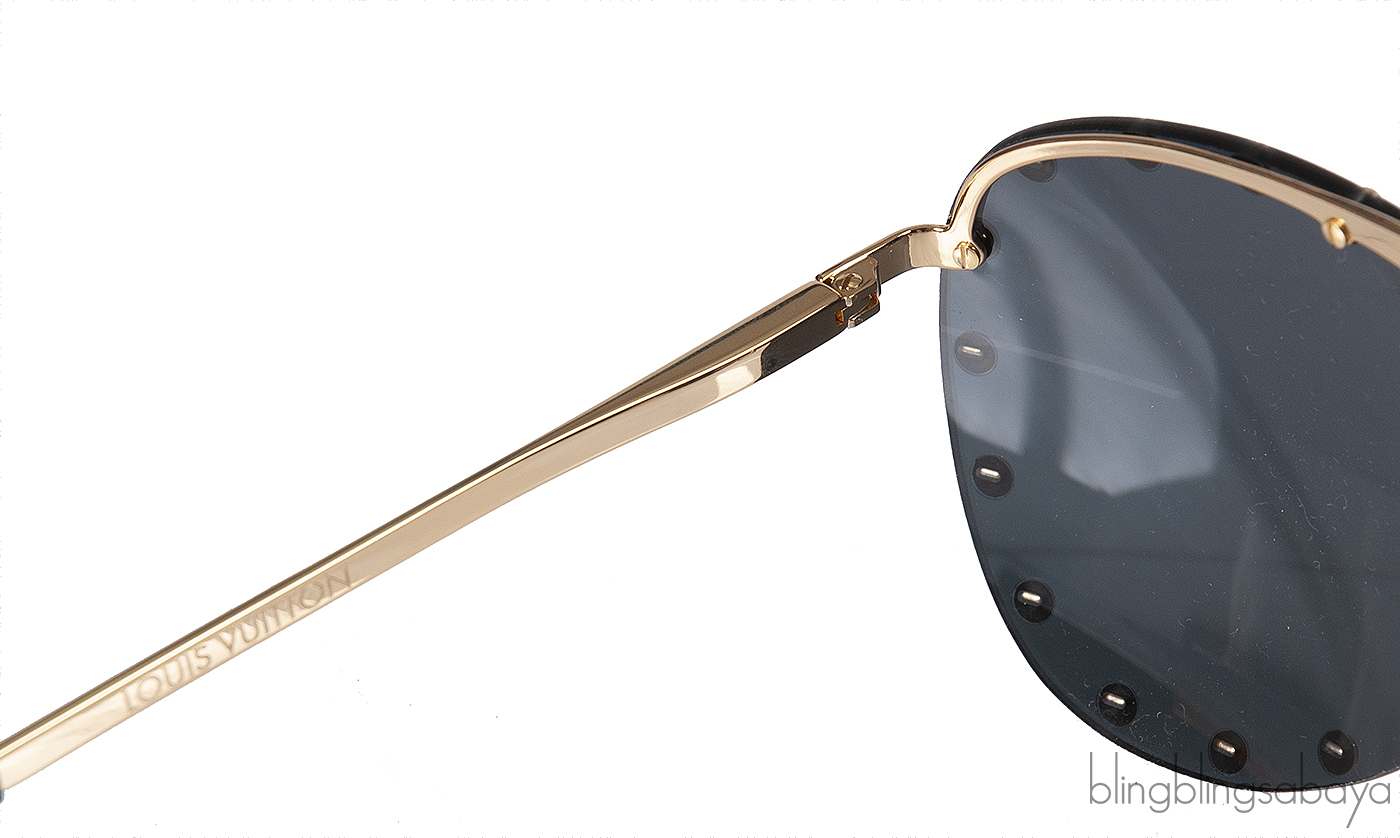 This Louis Vuitton Z0923U Party Aviator Sunglasses features a gold tone metal frame embellished with studs. It has the classic aviator style with mirrored silver lenses, nose pads, and Louis Vuitton brand signature on the temple.