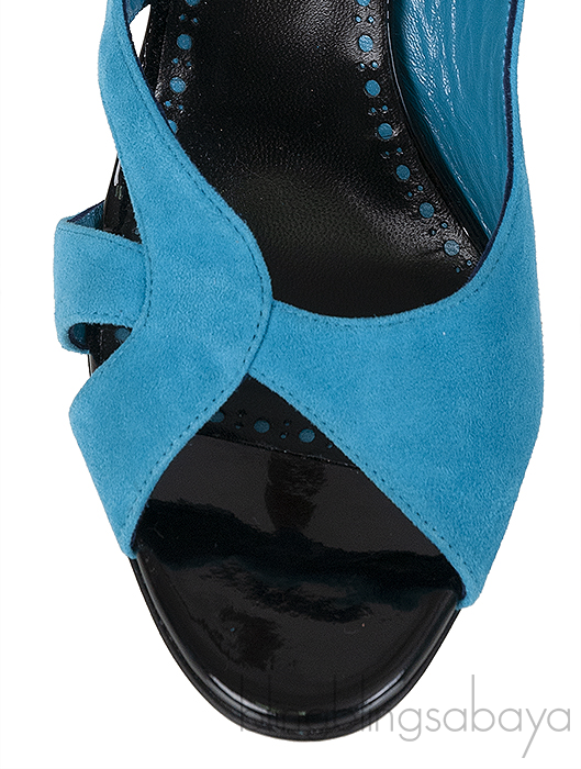 These Bi-color Strappy Sandals from Manolo Blahnik are crafted from blue suede leather upper, black patent leather slingback and leather lining. These sandals features a strappy design with peep almond toe, slingback, silver buckle fastening, stiletto heels measuring 100 mm high.