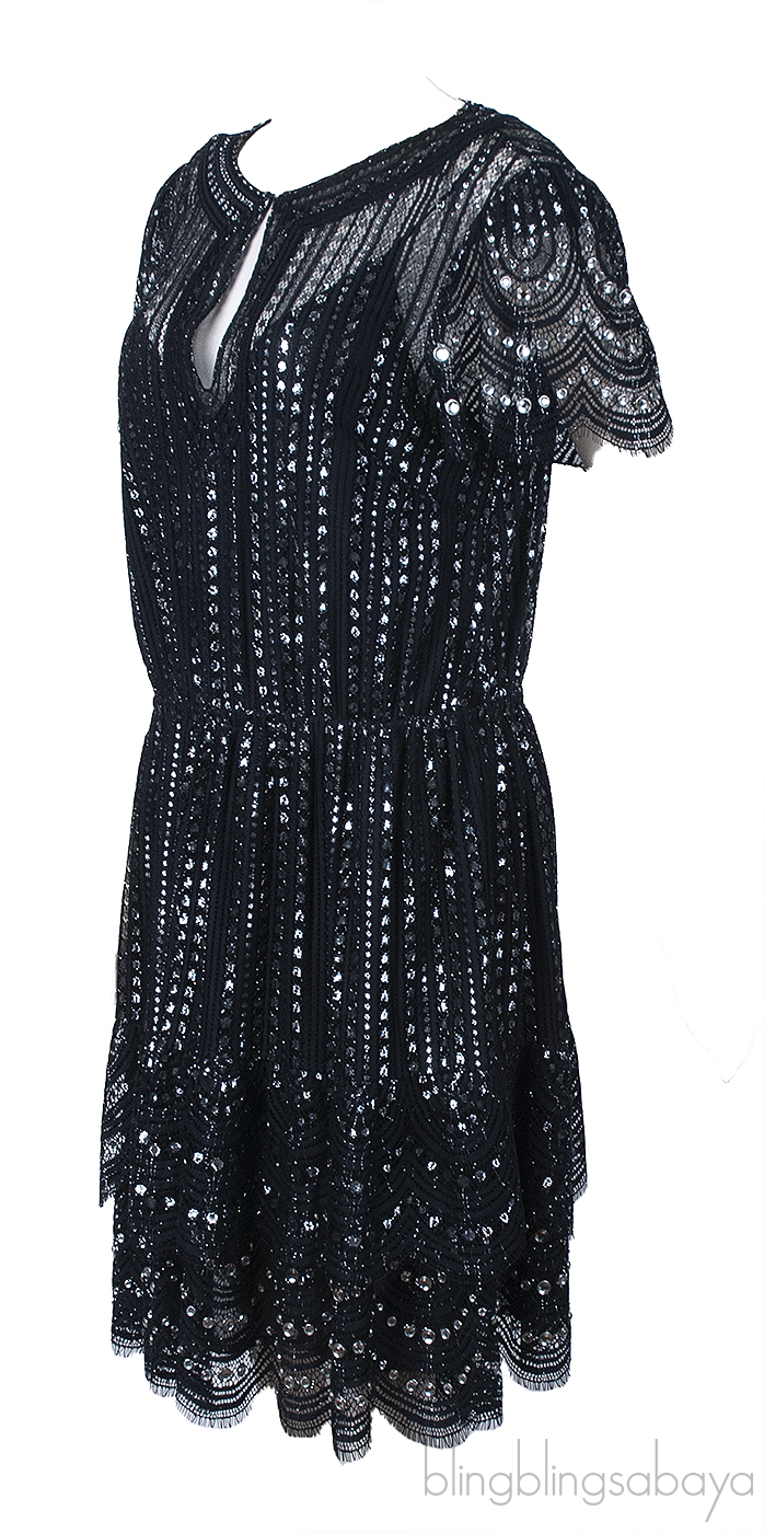 This Michael Kors Black Lame Studded Lace Dress is crafted from polyester and metallic threads. This dress features a slightly see-through studded lace overlay, scallop edges, short sleeves, split neckline and mini-length.