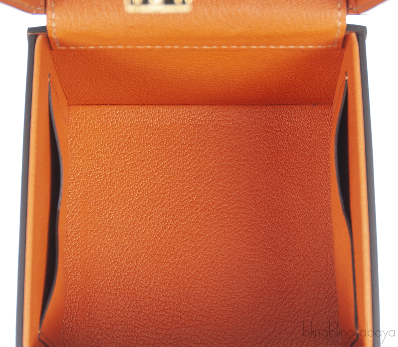 This Mini Vanity Case Etoupe Clutch Bag by Moynat is elegantly crafted from etoupe calfskin leather, adorned with gold hardware. It includes a coordinating leather wrist strap and a secure silver flip lock. Upon opening, you'll find a vibrant orange leather interior with convenient patch pockets for organization.