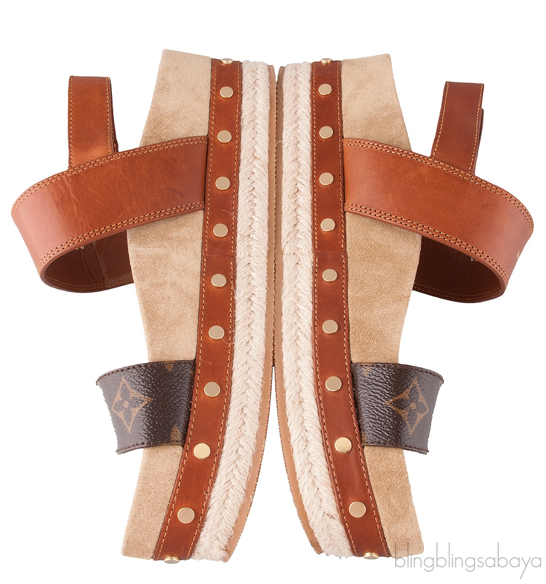 This Monogram Platform Sandals from Louis Vuitton is crafted from tan calf leather and Monogram canvas. This sandals features a open toe, straps across the vamp, slingback with buckle fastening and rubber sole.