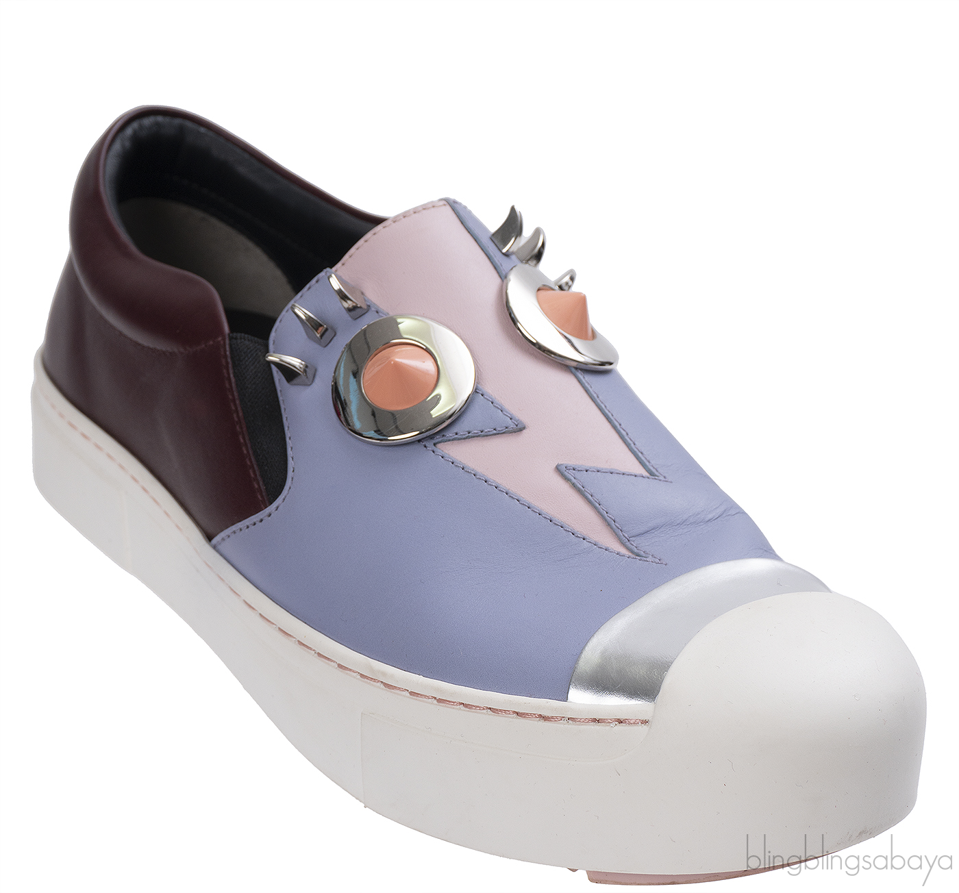 These Monster Slip On Sneakers from Fendi are crafted from multicolor leather upper with black leather lining. These sneakers features a monster motif with orange eyes surrounded with silver metal and silver lashes, round rubber toe, elastic on side vamp, fendi logo and rubber sole.