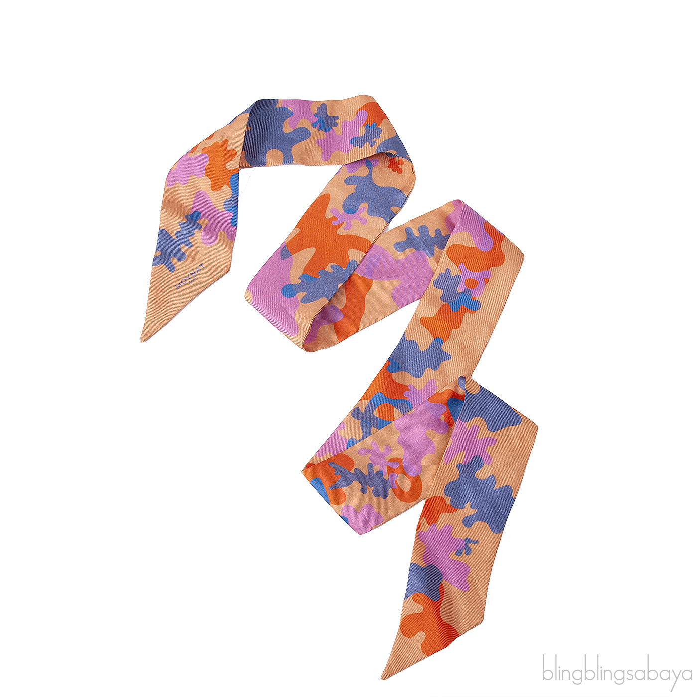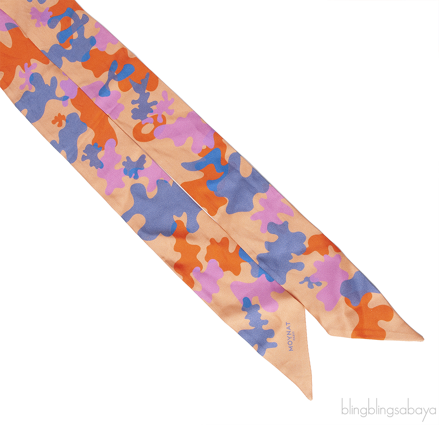 This Orange Multi-color Abstract Print Twilly from Moynat is crafted from orange farbic with multi-color abstract print, Moynat Paris printed on the edge.