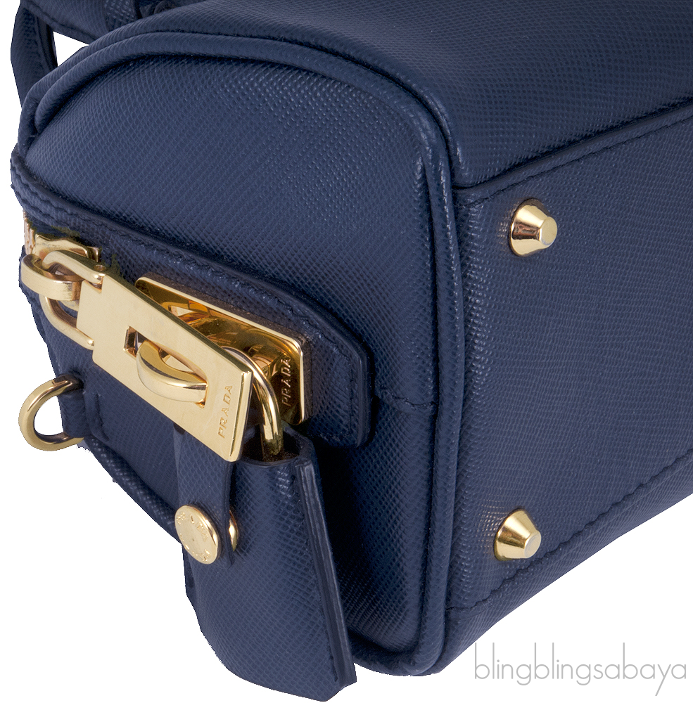 This adorable Navy Blue Mini Top Handle Bag from Prada is crafted in navy blue saffiano leather accented with the gold plated hardware. This mini tote features a metal lettering logo on a triangle leather in a front and has detachable key chain hanging on the handle with cute two mini rolled leather handles. This bag has a top zip closure and detachable is whimsically dangling on the side. The interior is fully lined with signature jaguard lining and has no internal pocket.