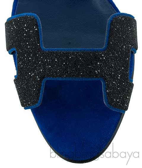 This classy Night 70 Blue Slingback Sandals from Hermes is crafted in luxurious blue suede goat leather with tonal stitching. This features an iconic "H" vamp with crystal powder in black, permabrass buckle slingback, round open toe, black lining and has small comfortable heels measuring 2.75 " / 7 cm.