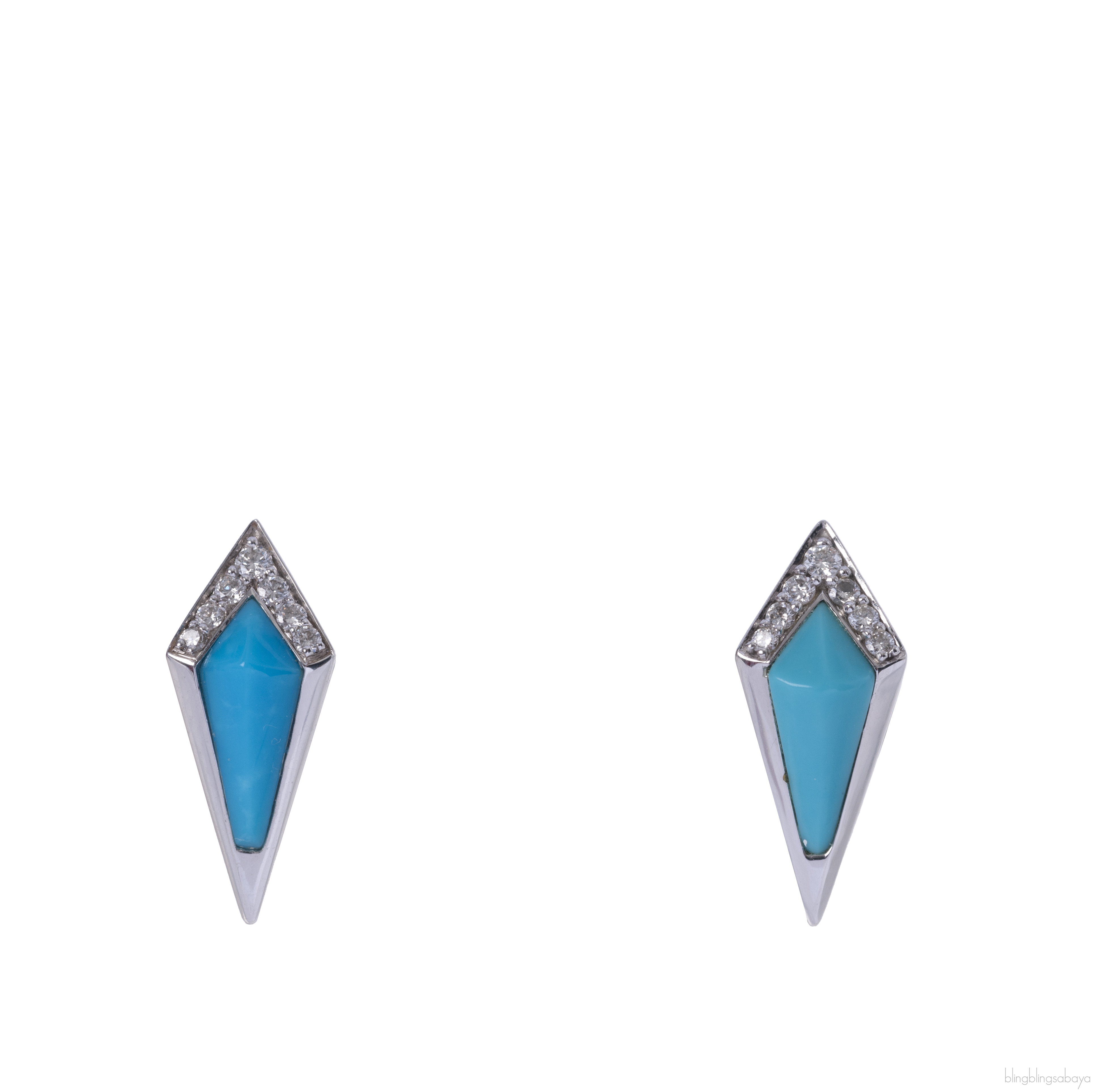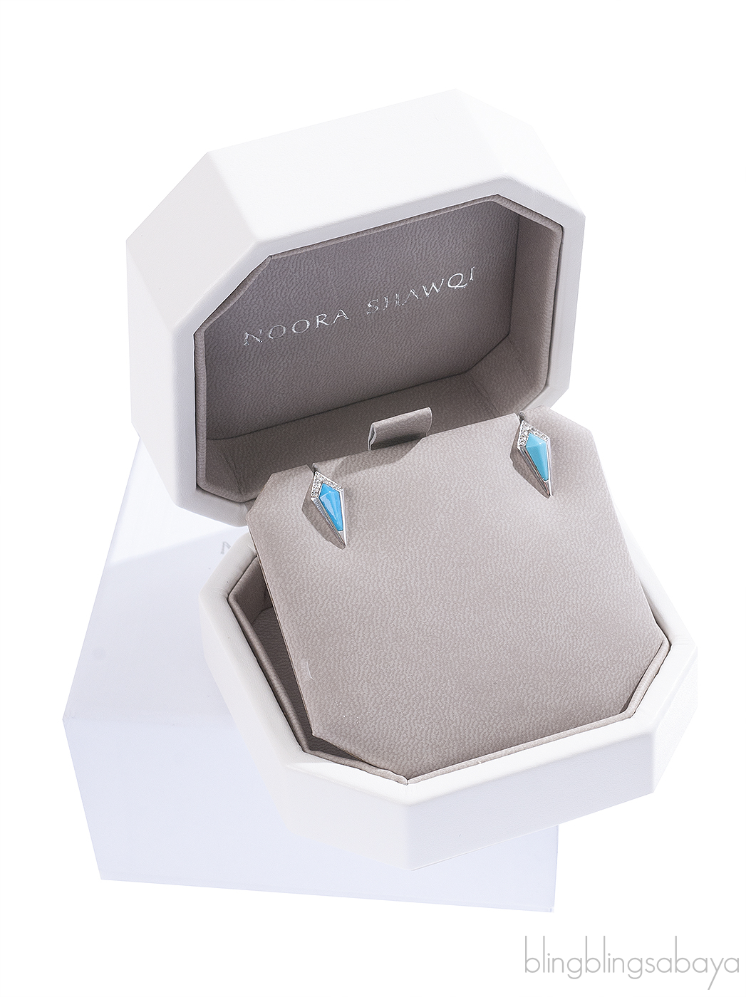 The Noora Shawqi Junonia Diamond & Turquoise Stud Earrings bring a chic, modern edge with their crisp white-gold setting and bold geometric silhouette. Sparkling 0.09 ct diamond accents meet 1.1 ct of vibrant turquoise, creating a standout piece that’s effortlessly sophisticated.