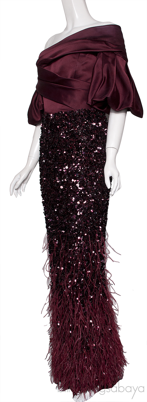 This Off-Shoulder Burgundy Feather Gown from Elizabeth Kennedy is crafted from 100% Silk embellished with sequins and 100% Ostrich feather; Lining 95% Silk & 5% Spandex. This gown features an off the shoulder neckline, draped sleeves, a wrapped bodice, zip fastening at rear and a feather embroidered skirt and glimmering sequins and floor length.