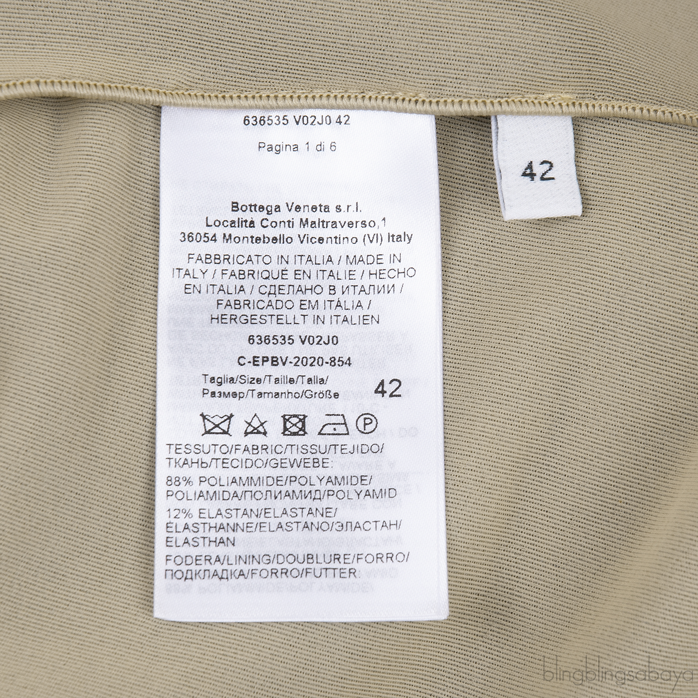 This Olive Green V-neck Dress from Bottega Veneta is crafted from 88% Polyamide and 12% Elastic fabric in olive green hue featuring a v-neckline, cut out sleeves, button fastening at back, front, back and side slits