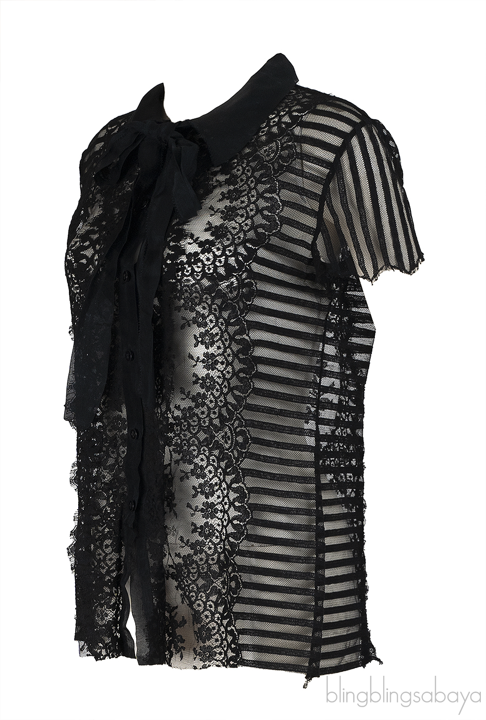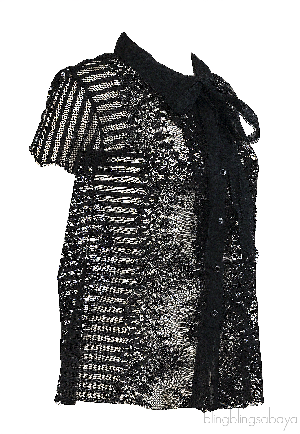 This Oscar de la Renta black sheer blouse is crafted from 100% silk. Designed with a round neckline and self-tie ribbon, it features short sleeves, front button fastening, and delicate floral lace detailing at the front and back.