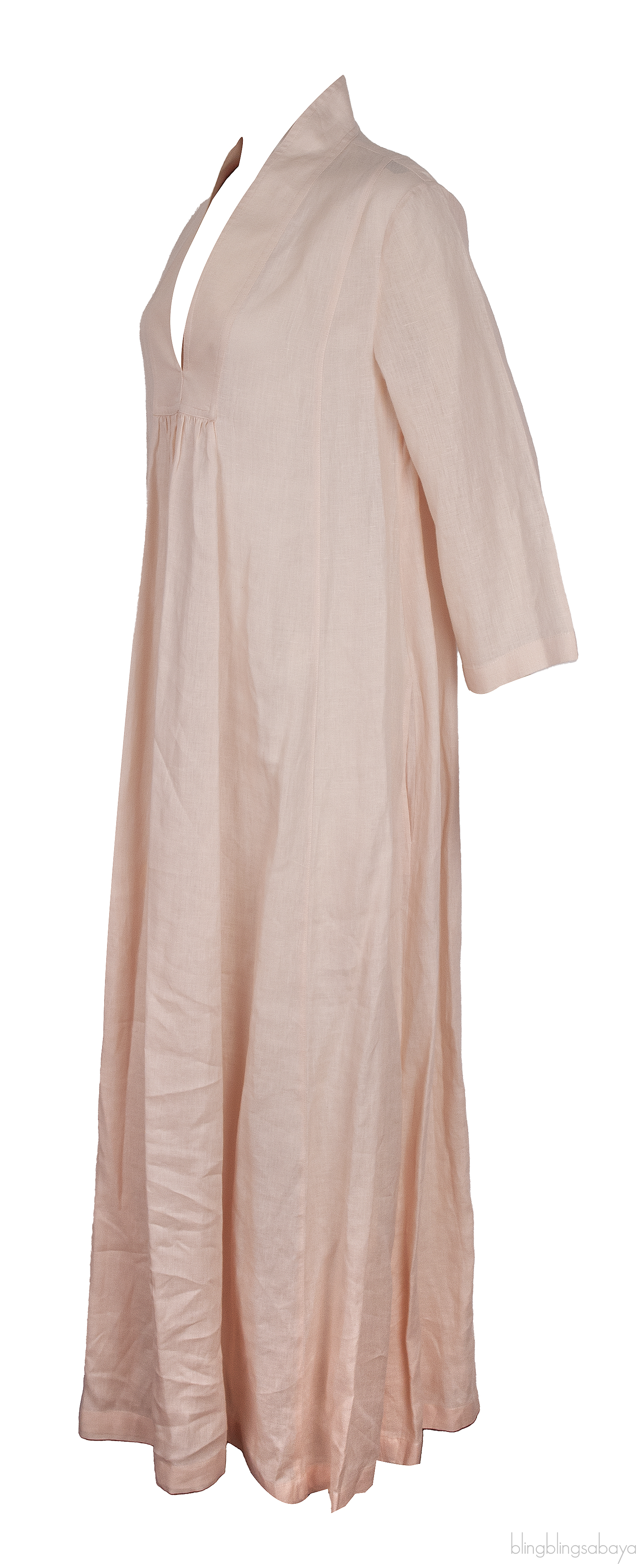 This Peach Linen Kaftan Dress from Loro Piana is crafted from 100% Linen in peach color featuring a v-neckline, long sleeves, side pockets and maxi length.