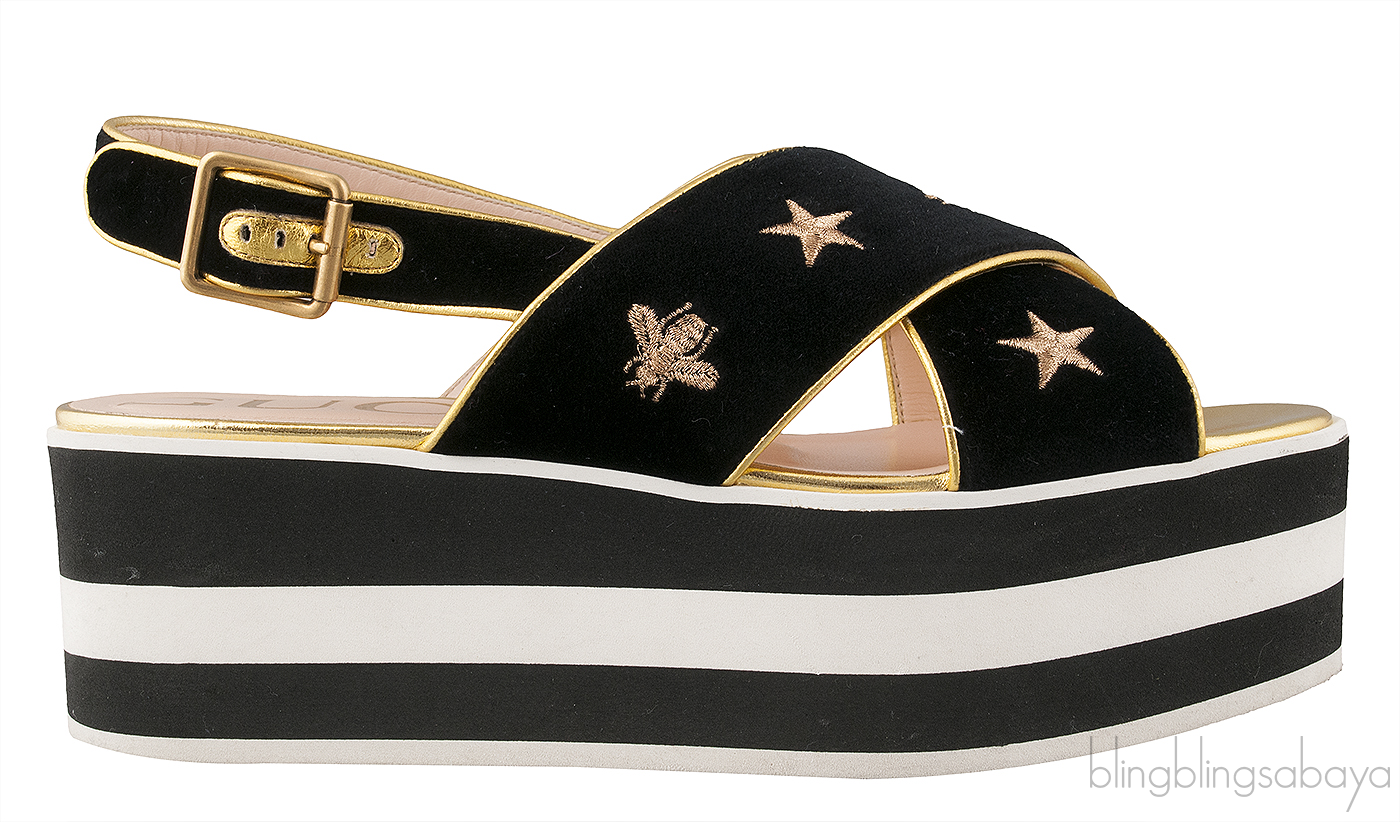 These Peggy Star Bee Platform Sandals from Gucci are crafted in black velvet upper and nude leather lining. These platform sandals features a crossover upper embroidered with bees and stars in gold thread. It has with buckle fastening and black & white hue platform in 50 mm high and heels measuring 60 mm.
